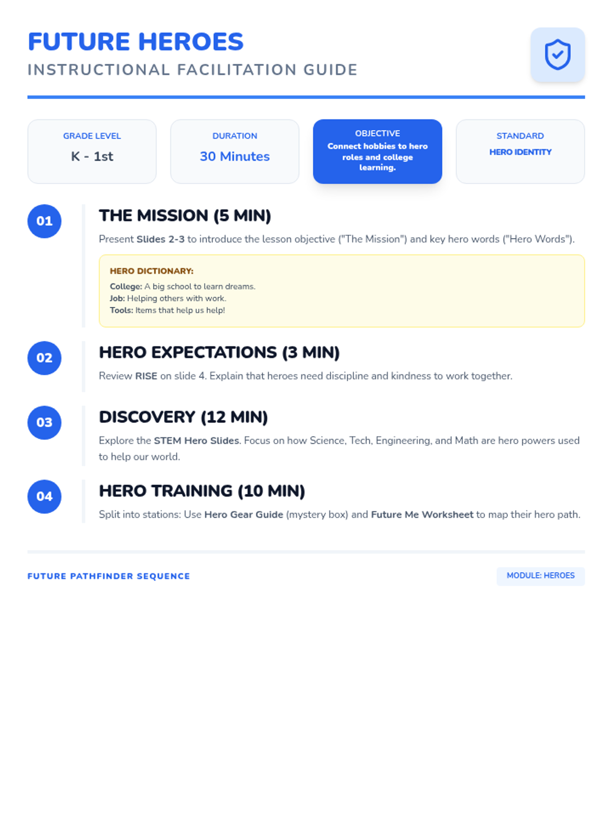 Updated 30-minute instructional guide for teachers facilitating the "Future Heroes" lesson. Includes explicit mission objectives and hero vocabulary dictionary for K-1 students.