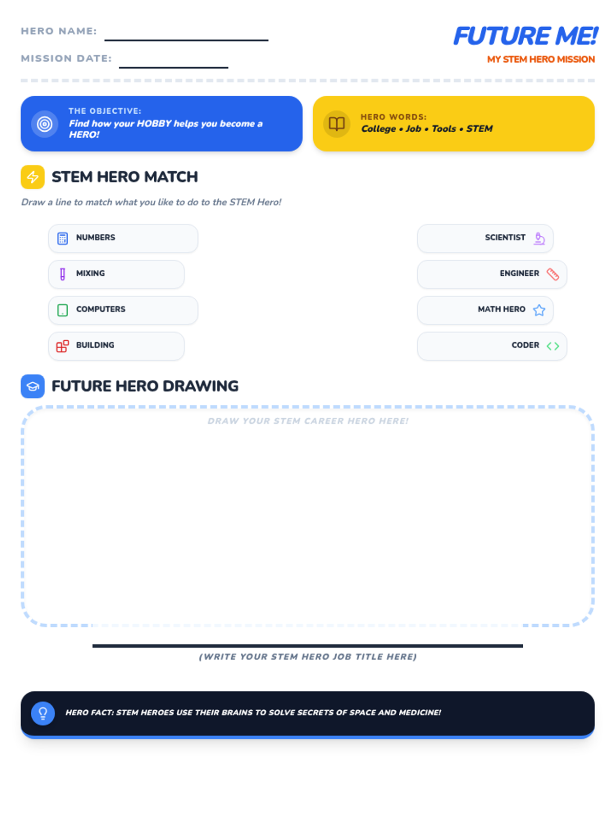 Updated STEM Hero Worksheet for K-1 students. Now features a "Mission Briefing" panel with Lesson Objectives and Hero Vocabulary directly on the sheet for student and parent reference. Tightened layout to fit on 1 page.