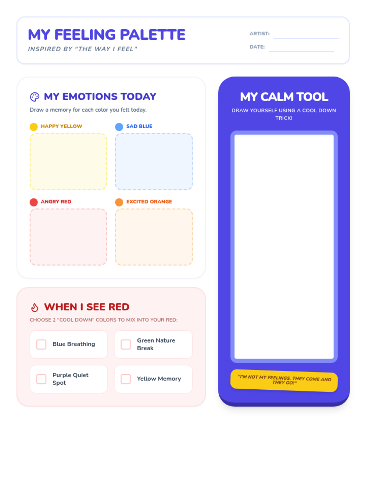 A student worksheet designed to accompany 'The Way I Feel'. It allows students to map their daily emotions to specific colors and choose personal 'cool down' strategies for managing anger.