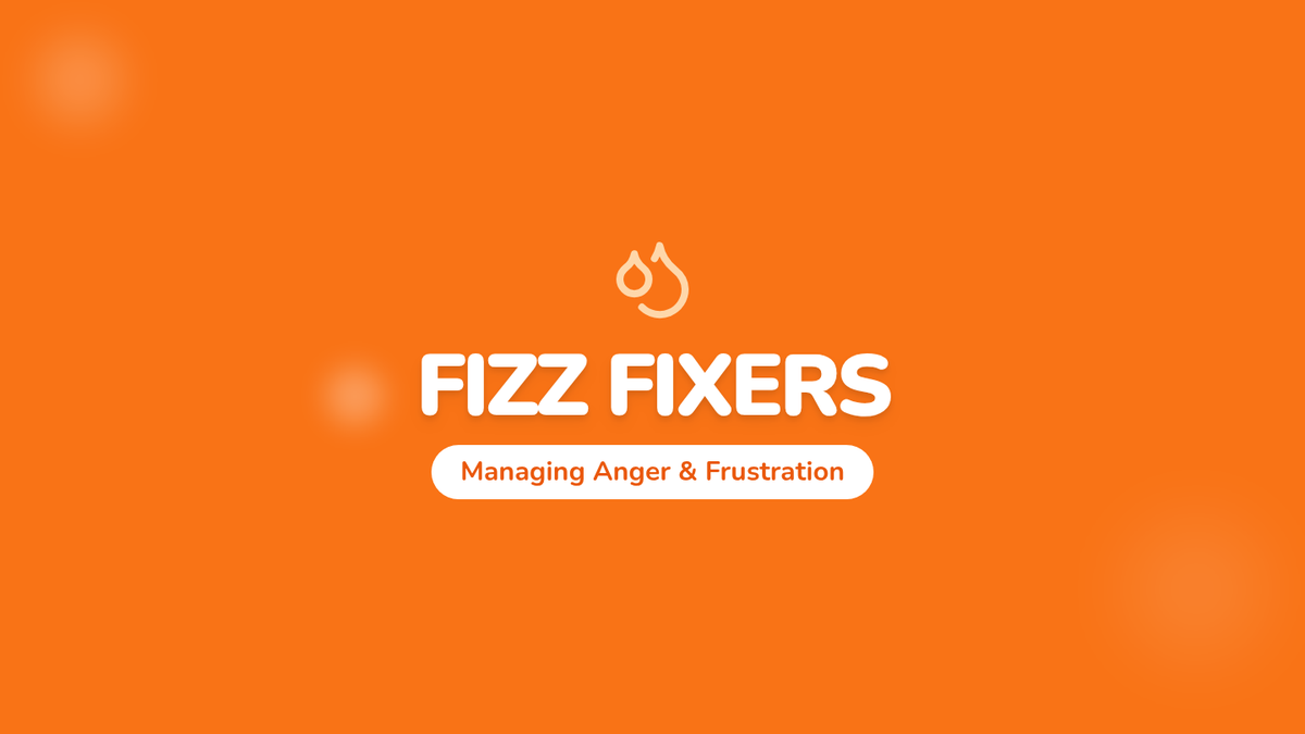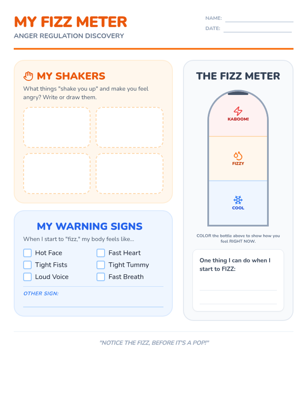 A student worksheet for identifying personal anger triggers ('Shakers') and physical warning signs. It features a 'Fizz Meter' soda bottle graphic for self-assessment.