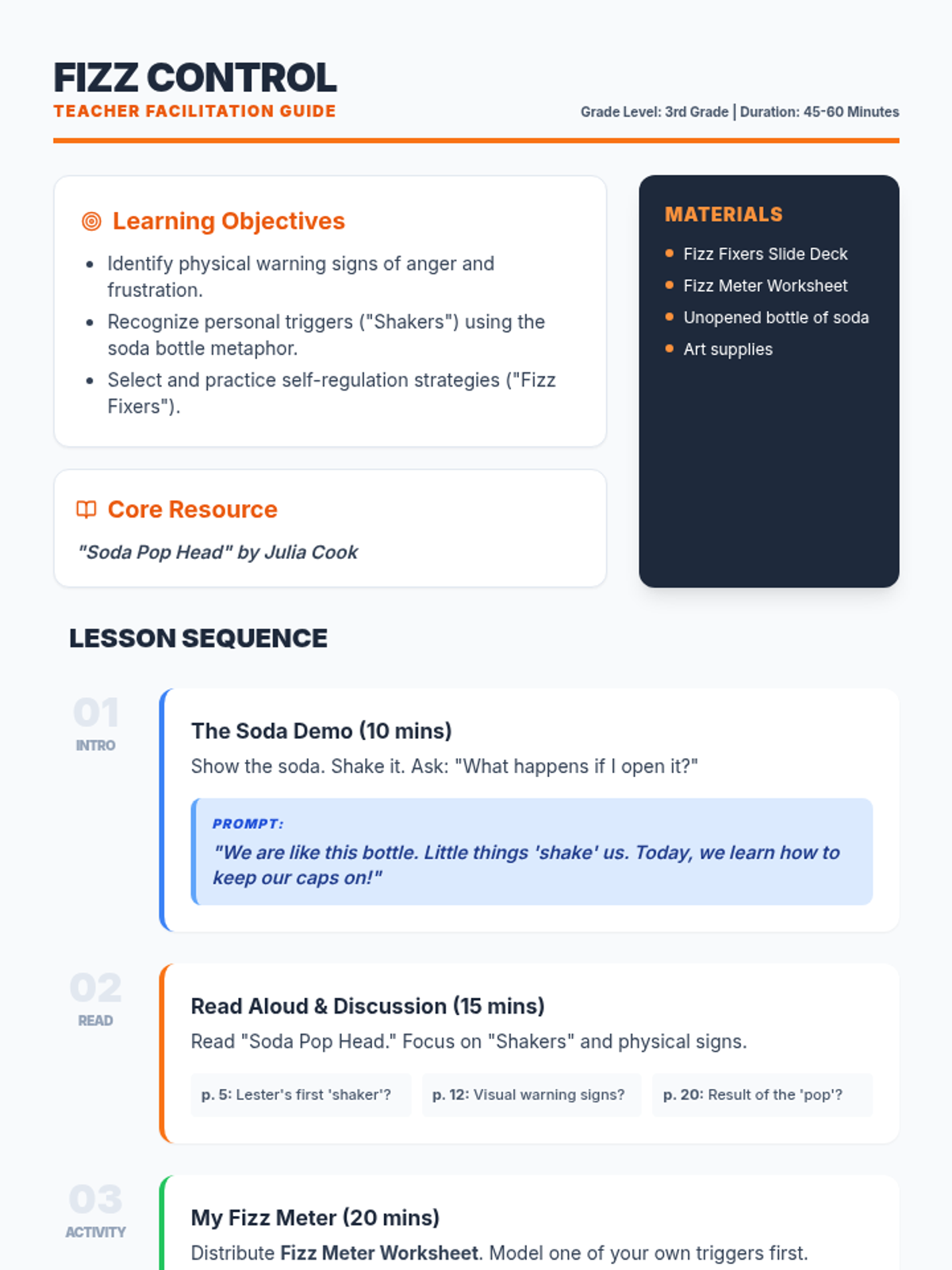 A comprehensive facilitator guide for the 'Fizz Fixers' SEL lesson. Includes a materials list, step-by-step lesson sequence with time allocations, and specific discussion prompts for the read-aloud.