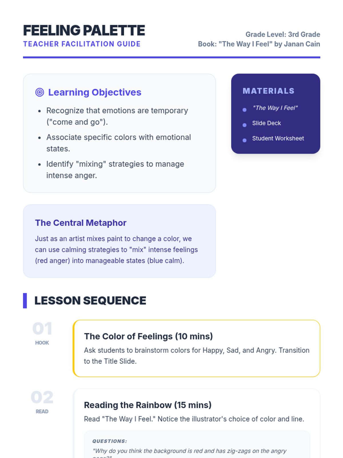 A facilitator guide for the 'Colorful Feelings' lesson. It provides a structured flow for using 'The Way I Feel' by Janan Cain to teach emotional awareness and regulation.