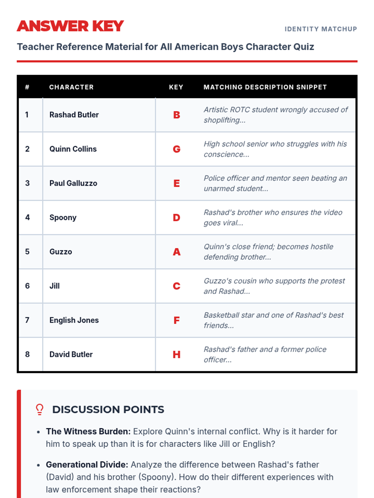 The teacher answer key for the All American Boys character quiz, including correct matching pairs and discussion points.