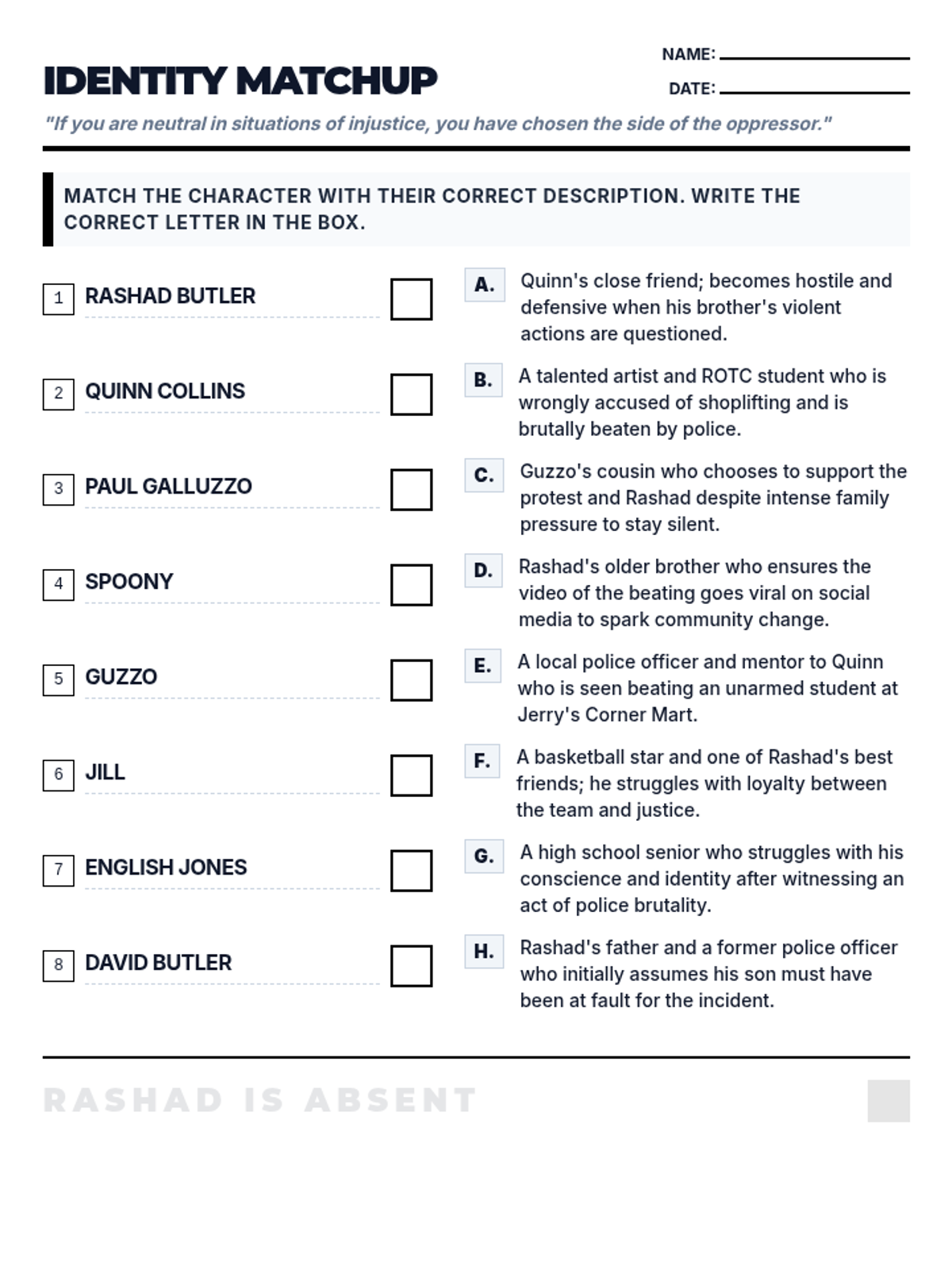 A matching quiz for the book All American Boys that challenges students to identify key characters and their roles in the narrative.