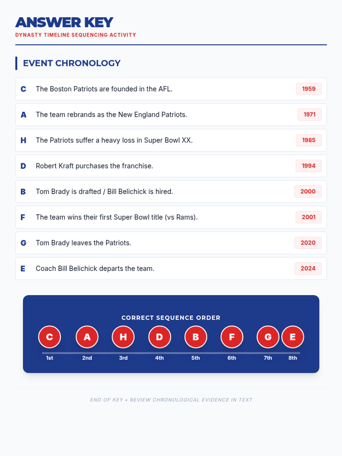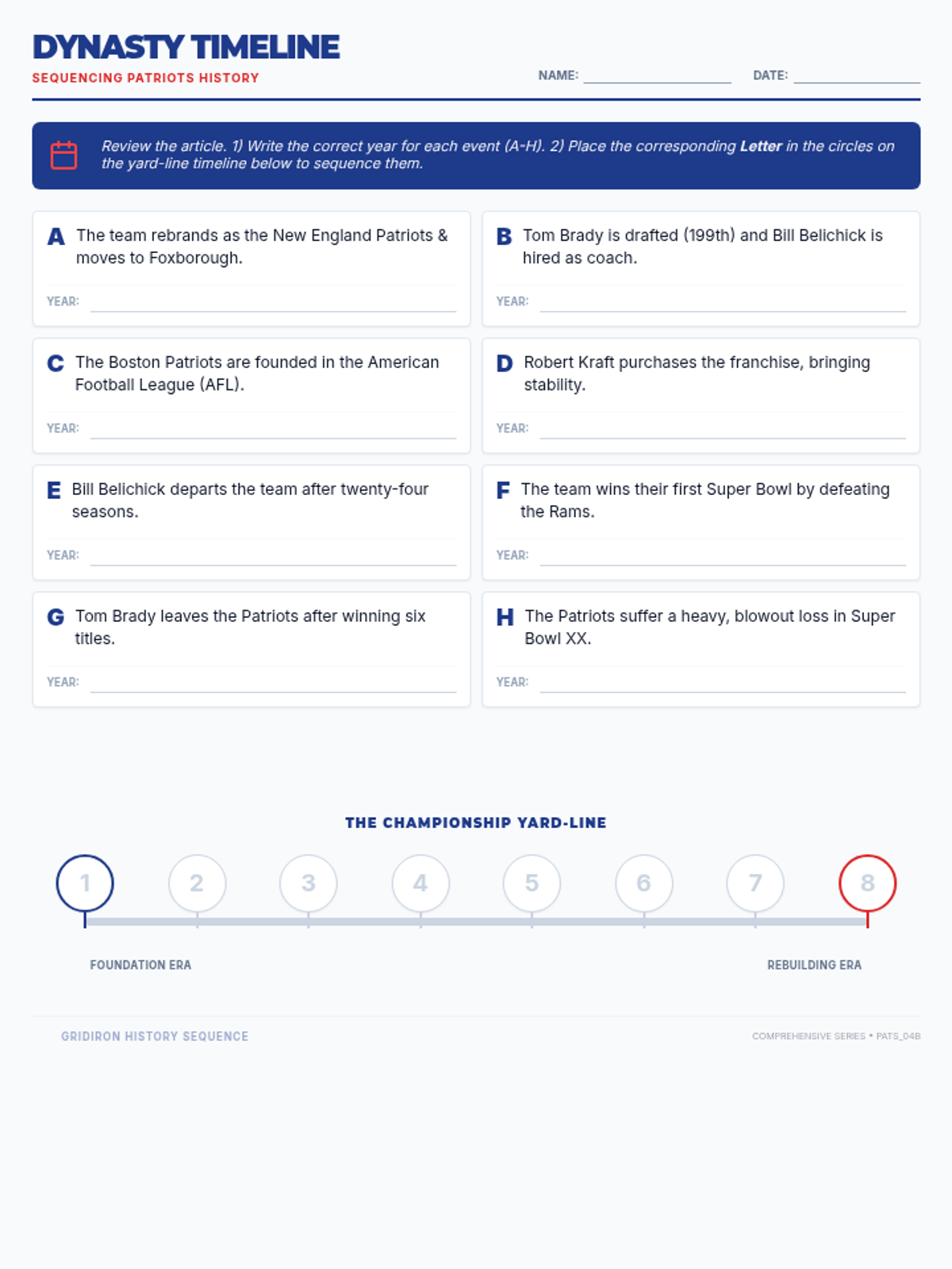 A sequencing worksheet for 8th-grade students to order key events from the New England Patriots' franchise history based on the previous reading passage. Includes an event matching section and a visual timeline. Corrected to fit on a single page.