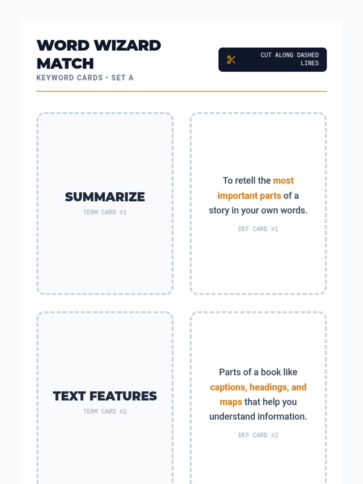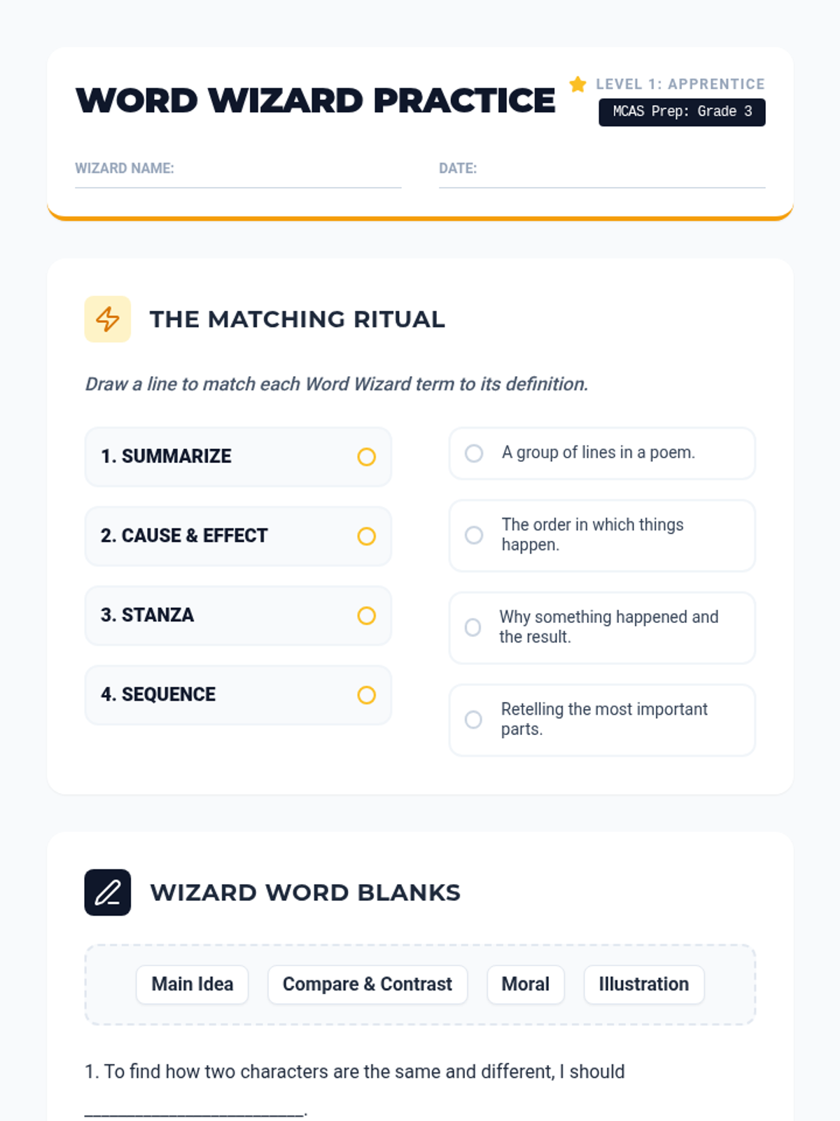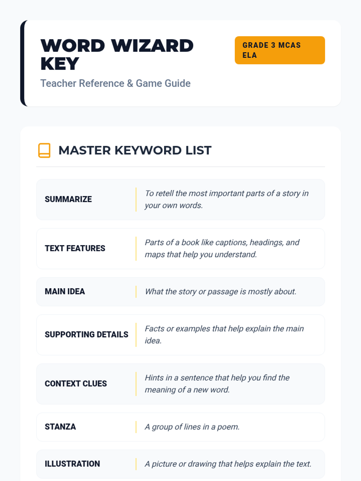 A teacher-facing reference guide and answer key for the Word Wizard matching game. Includes the full list of MCAS ELA terms and definitions, plus instructional tips and game variations to maximize student engagement.