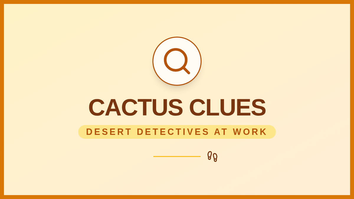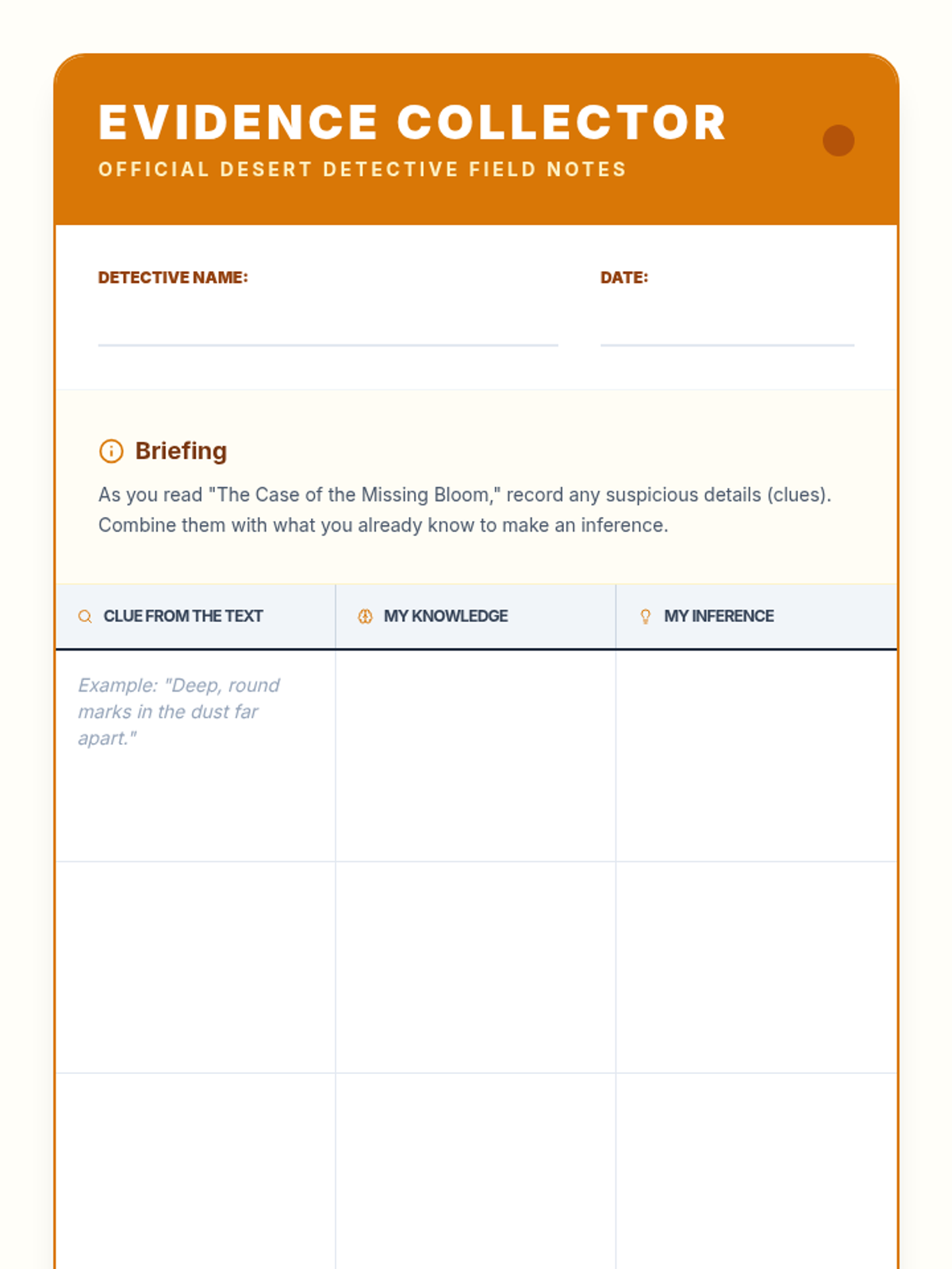 A visual presentation for introducing the concept of inference and launching the 'Desert Detectives' mystery lesson. Includes clear definitions, practice examples, and the mystery scenario using bold desert-themed visuals.