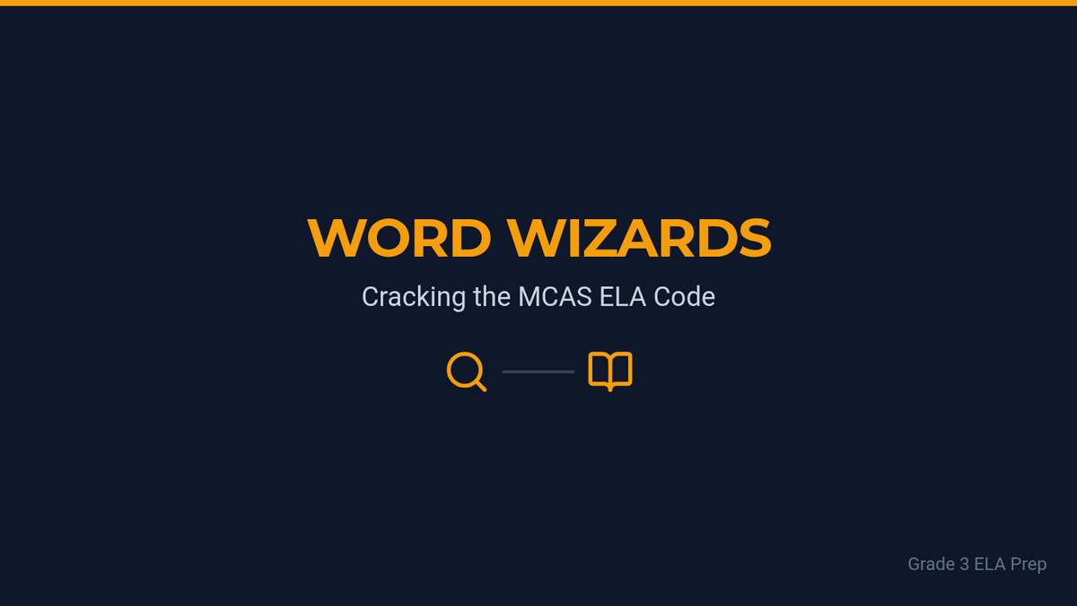 An engaging slide deck designed to introduce 3rd-grade students to essential MCAS ELA terminology. Each slide features a key test word (like summarize, text features, and main idea) with a child-friendly definition and visual cues to build comprehension and test-taking confidence.