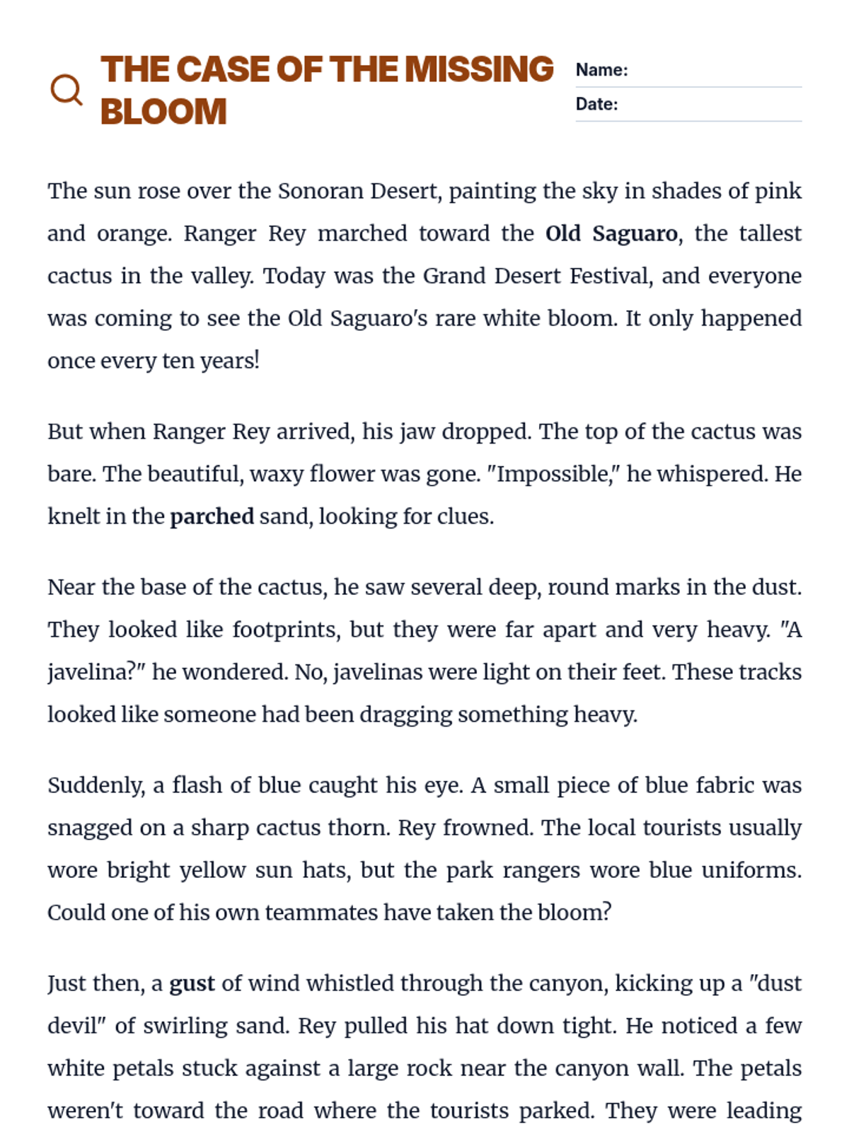 A 3rd-grade reading passage titled 'The Case of the Missing Bloom' set in the Sonoran Desert. Includes vocabulary support and five comprehension questions focused on making inferences, identifying textual evidence, and understanding cause and effect.