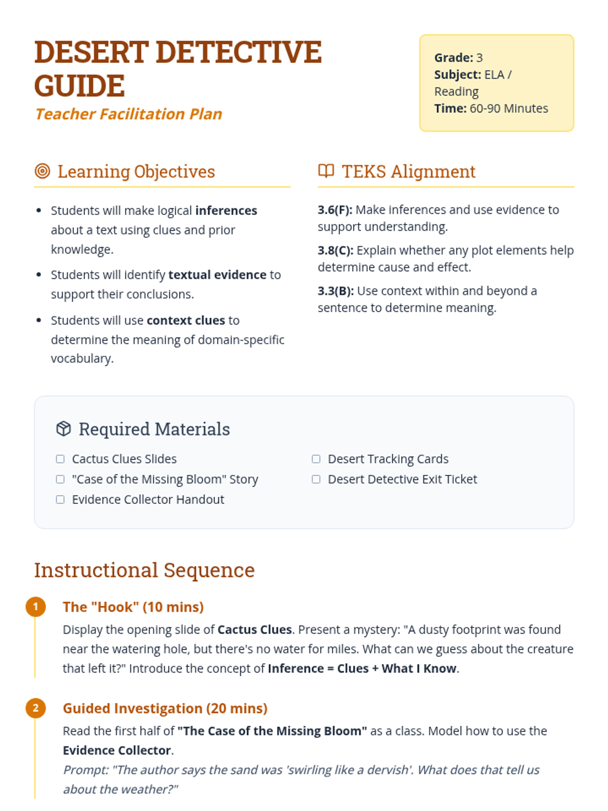 A comprehensive teacher guide for the 'Desert Detectives' reading comprehension lesson. It includes TEKS alignment (3.6F, 3.8C, 3.3B), a step-by-step instructional sequence, and a detailed answer key for the mystery story activity.