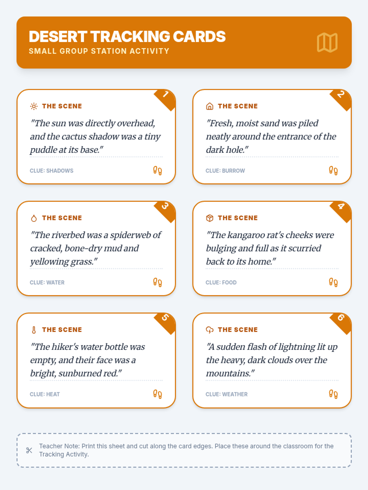 A set of six task cards for a classroom activity. Each card features a descriptive text snippet (clue) about the desert, designed to help students practice making inferences and drawing conclusions.