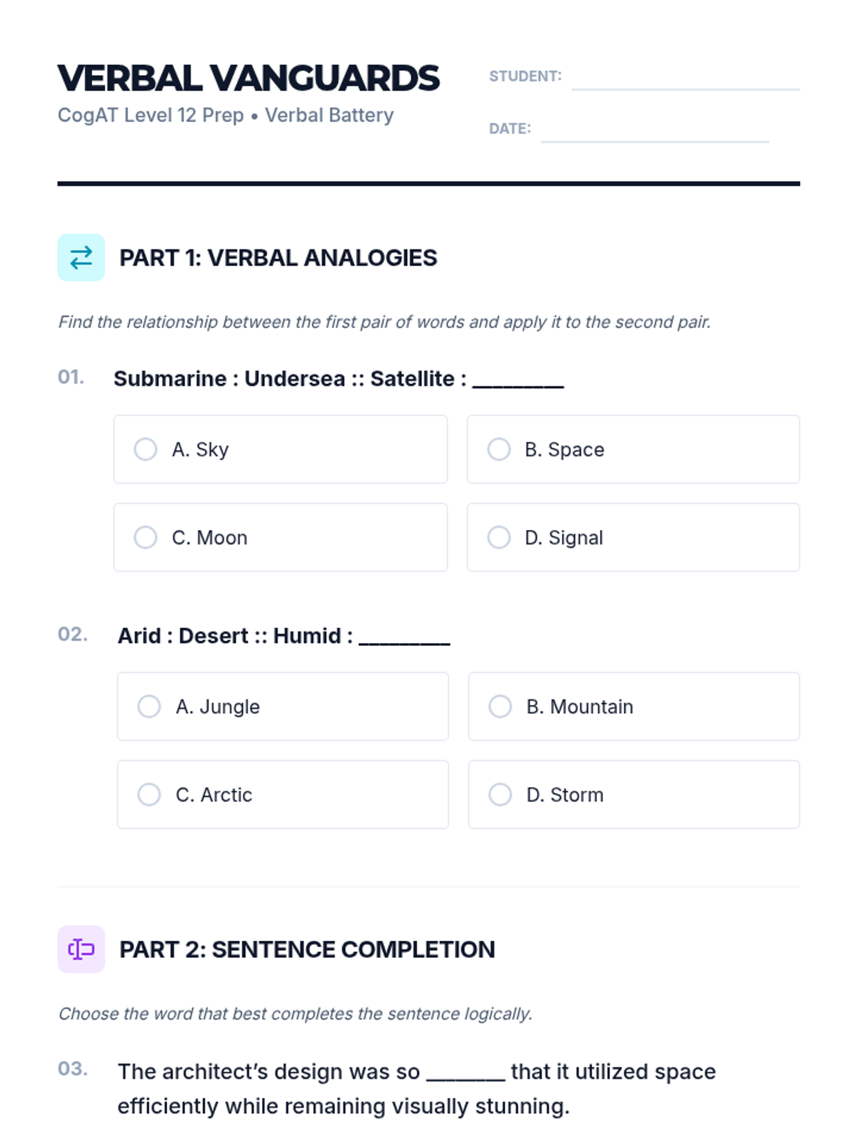 A student-facing practice worksheet for the Grade 6 CogAT Verbal Battery, featuring challenging questions across all three subtests with standardized styling and improved layout. Corrected page breaks for Part 3.