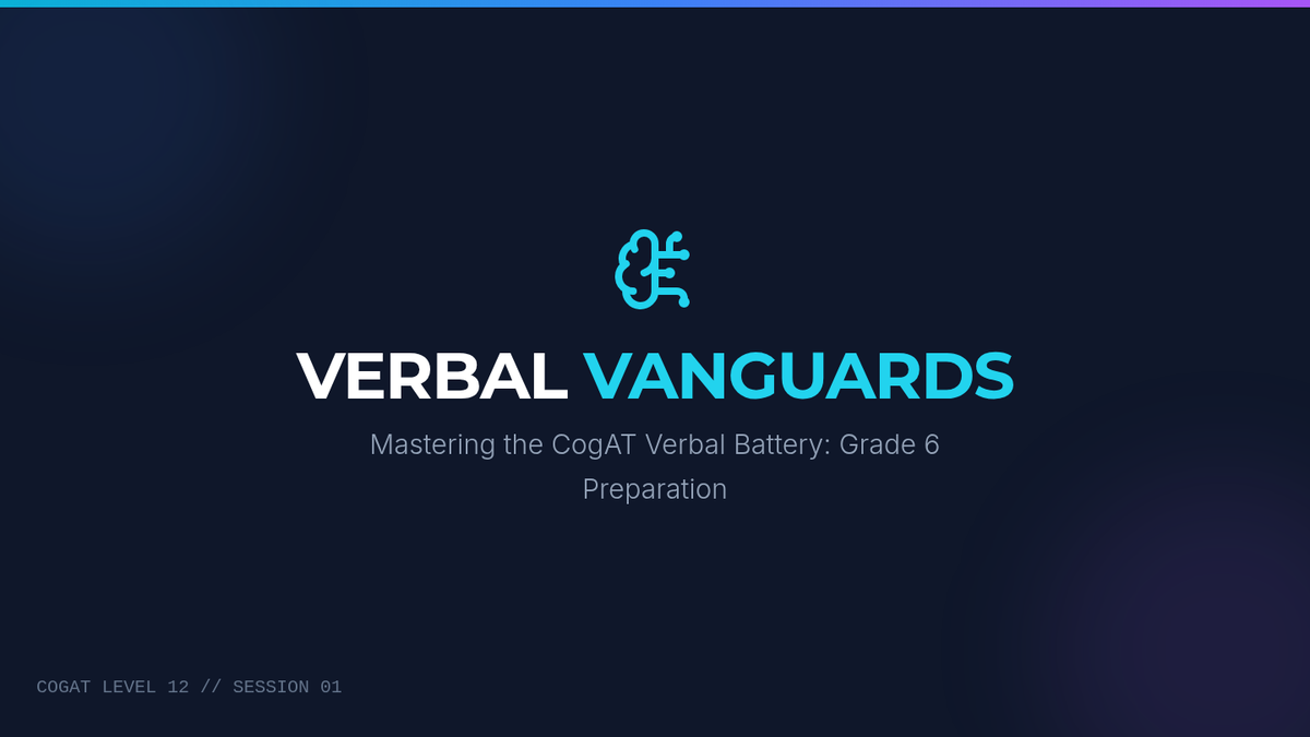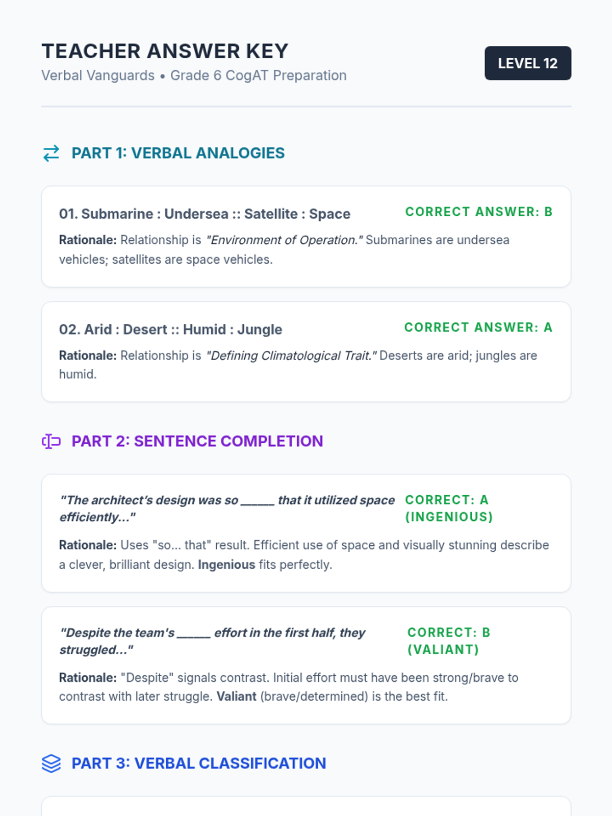 A high-impact slide deck for Grade 6 CogAT Verbal Battery preparation, featuring strategy breakdowns and interactive practice for Analogies, Sentence Completion, and Classification. Correct answers have uniform styling for classroom discussion.