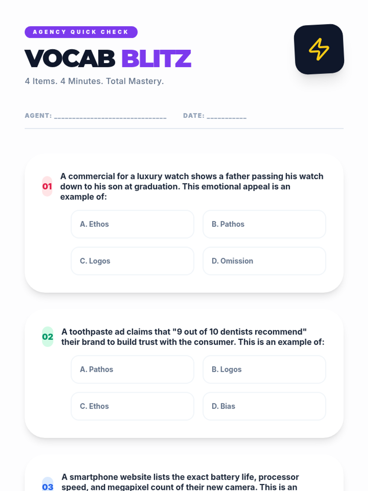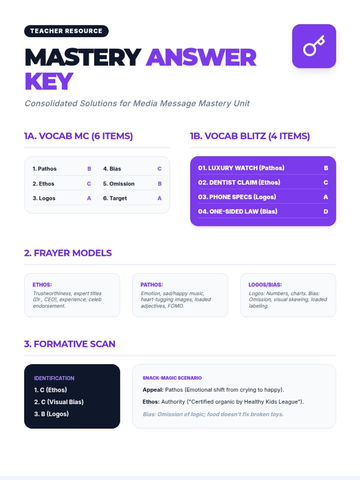 A comprehensive, high-energy instructional slide deck for the Media Message Mastery lesson. Includes a 16-slide sequence featuring the Digital Scan Audit and Persuasion Pivot Bell Ringers (Slides 4-5), Case Study video, Quiz Bee competition, instructional modeling, and collaborative activities. All text maintains high visibility (minimum 24px) with bold "Ad Agency" styling.