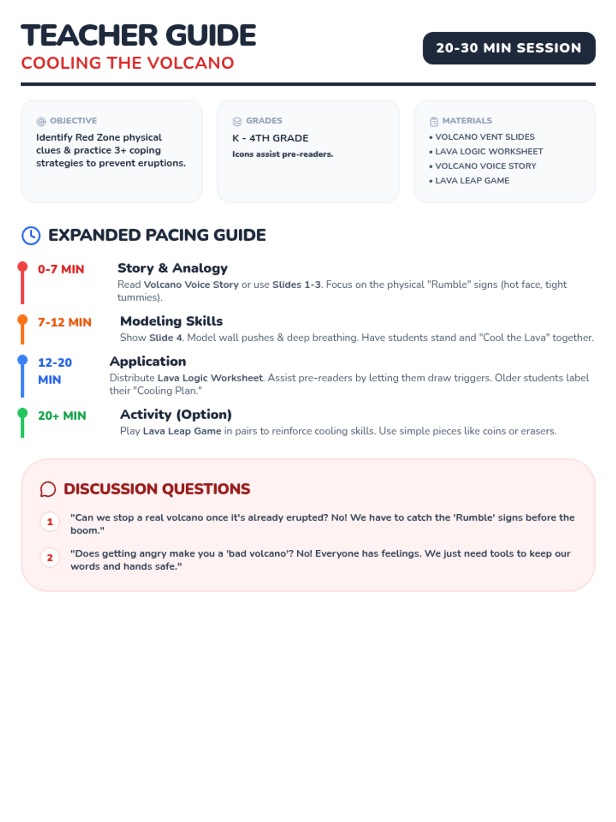 A concise 20-30 minute facilitation guide for teachers, including objective, pacing instructions, and discussion prompts to help students master the volcano analogy and cooling skills.