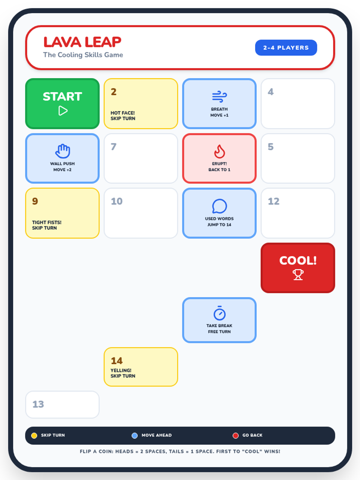 A printable board game where students navigate a path of 'Rumbles' and 'Eruptions' by identifying and applying cooling skills to reach the 'Cool!' finish line.