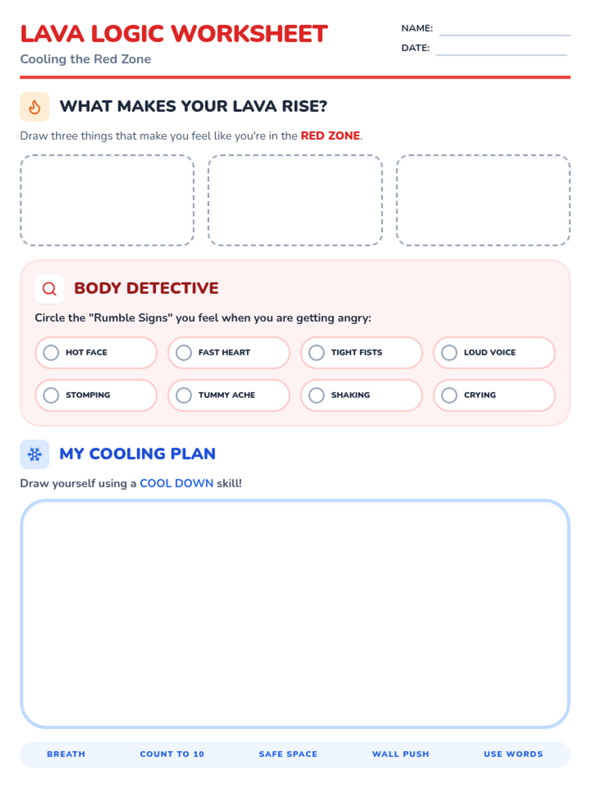 A print-ready worksheet where students identify their personal anger triggers, physical body clues (rumble signs), and create a visual 'cooling plan' for the Red Zone.