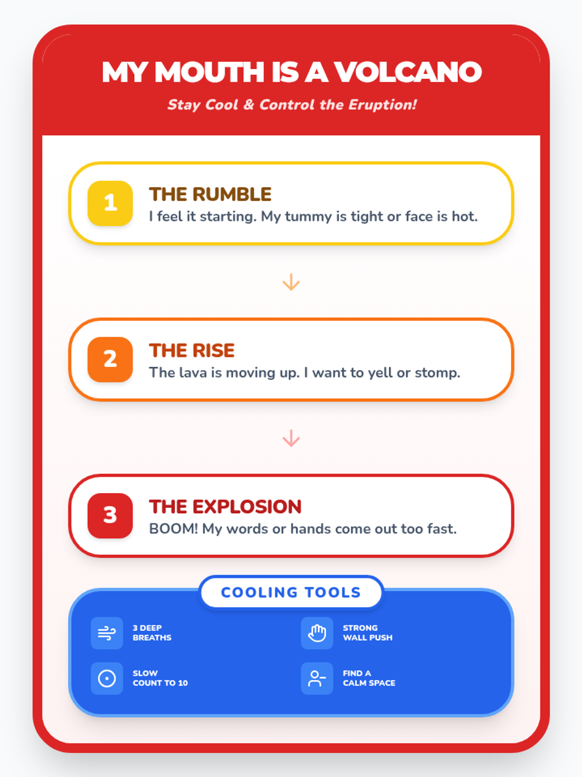 A 5-part social story using the volcano analogy to help students recognize the physical signs of anger and learn to use cooling strategies to prevent 'eruptions'.