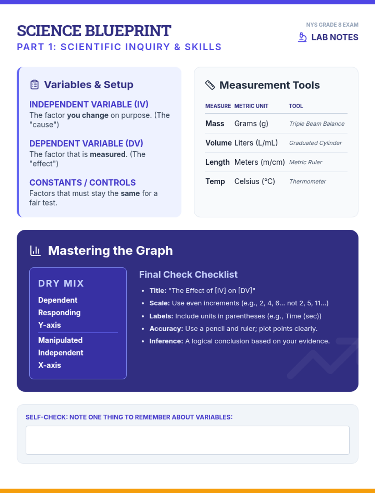 A fully optimized 4-page science study guide for the 8th-grade NYS science exam, featuring tight layout, fixed character encoding for chemical formulas with <sub> tags, improved student self-check areas, and clear domain summaries.