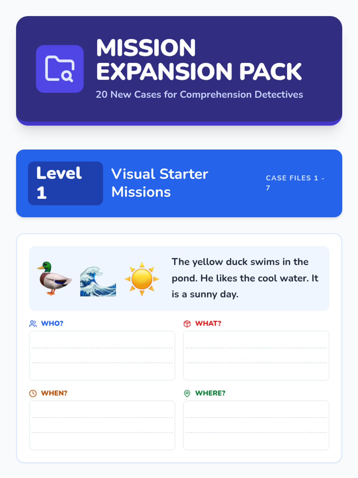 An extensive collection of 20 new tiered reading comprehension passages. Organized into three levels of increasing complexity, each mission features a unique scenario with structured answer areas for identifying Who, What, When, and Where.