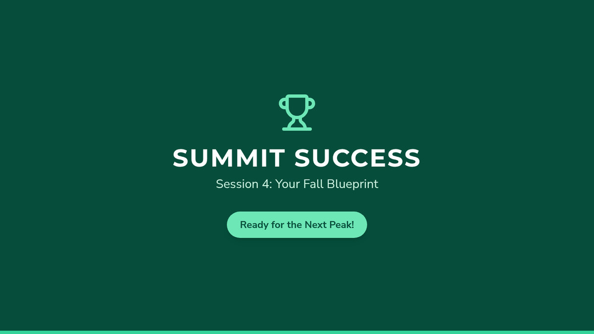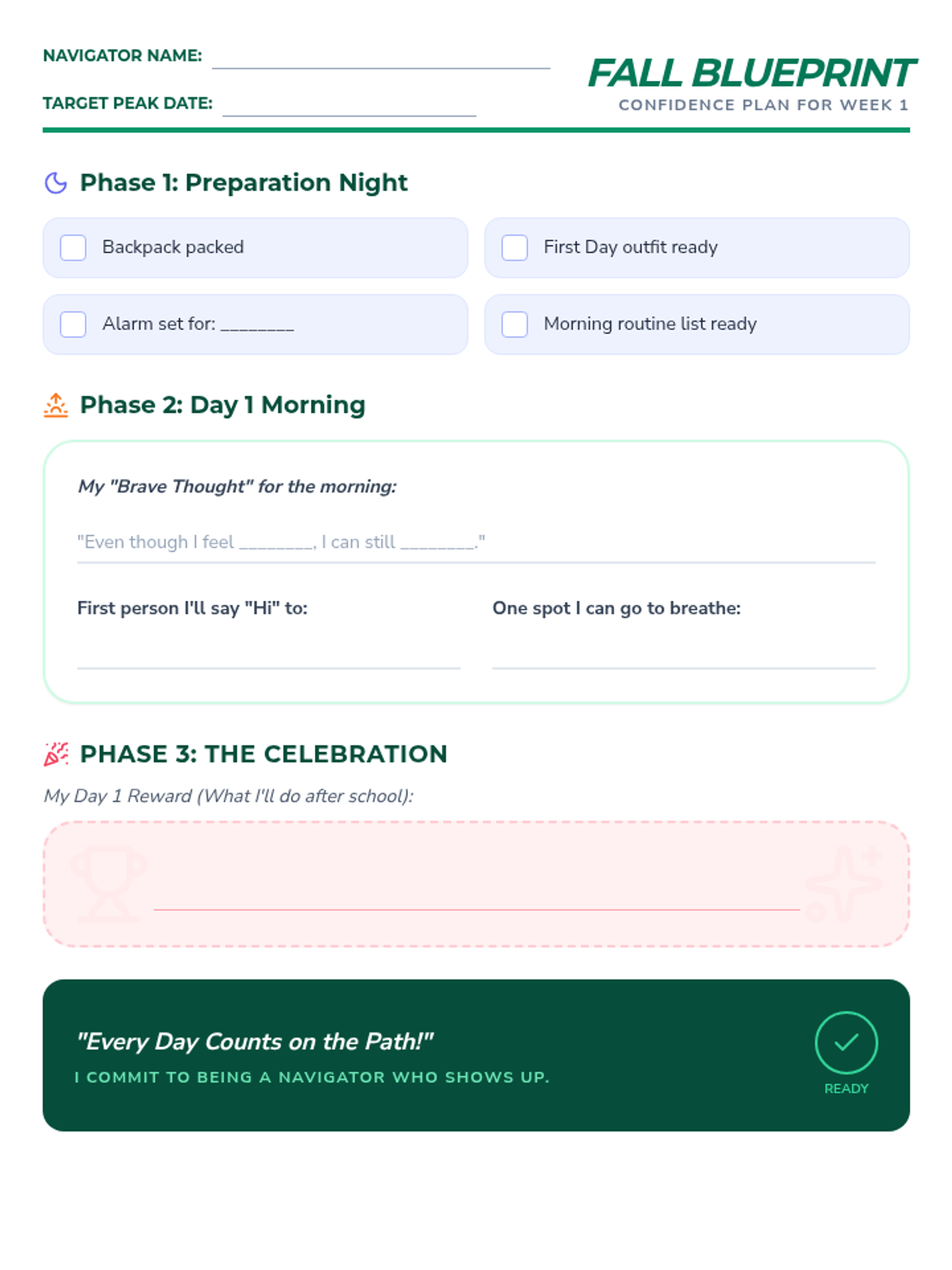 Student worksheet for the final session, featuring a 'Fall Blueprint' for morning routines, social connections, and a reward plan for completing the first day.