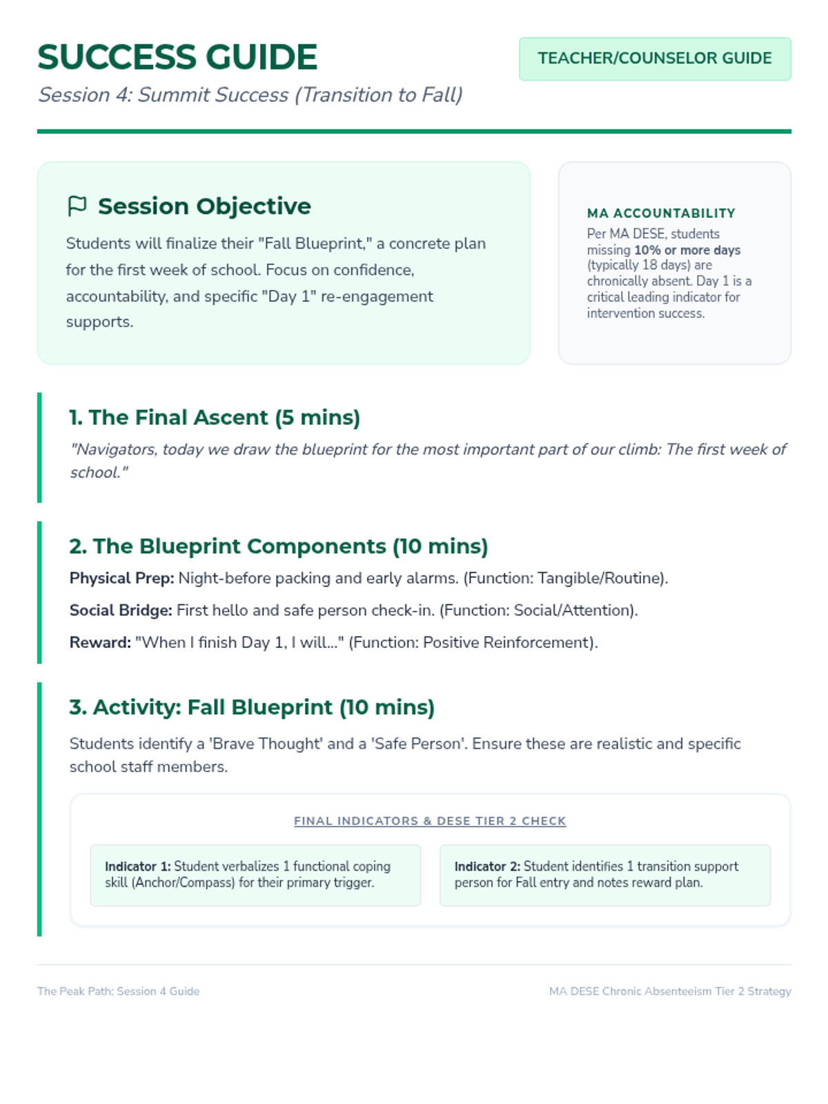 Teacher guide for the final session, focusing on fall transition blueprints, incentive structures, and MA accountability documentation.