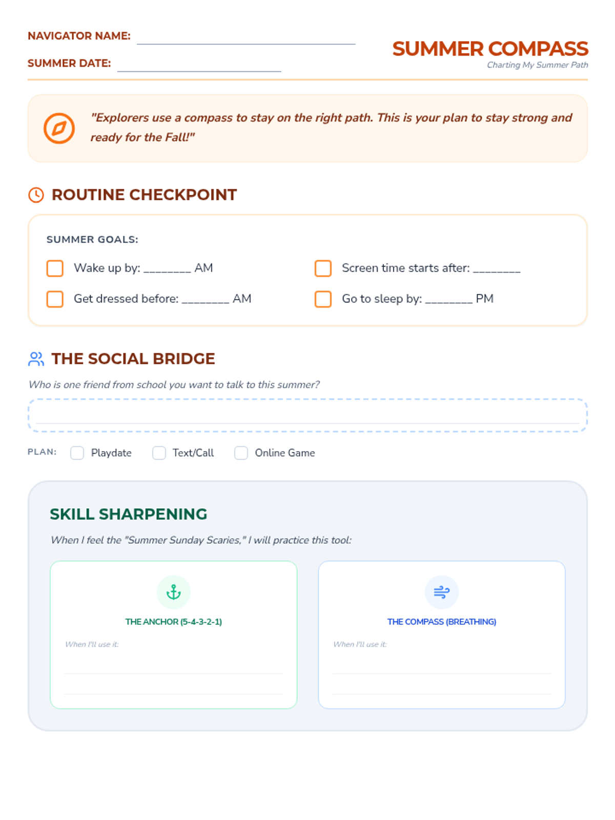 Student worksheet for Session 3, featuring a 'Summer Compass' plan for routines, social connections, and skill practice.