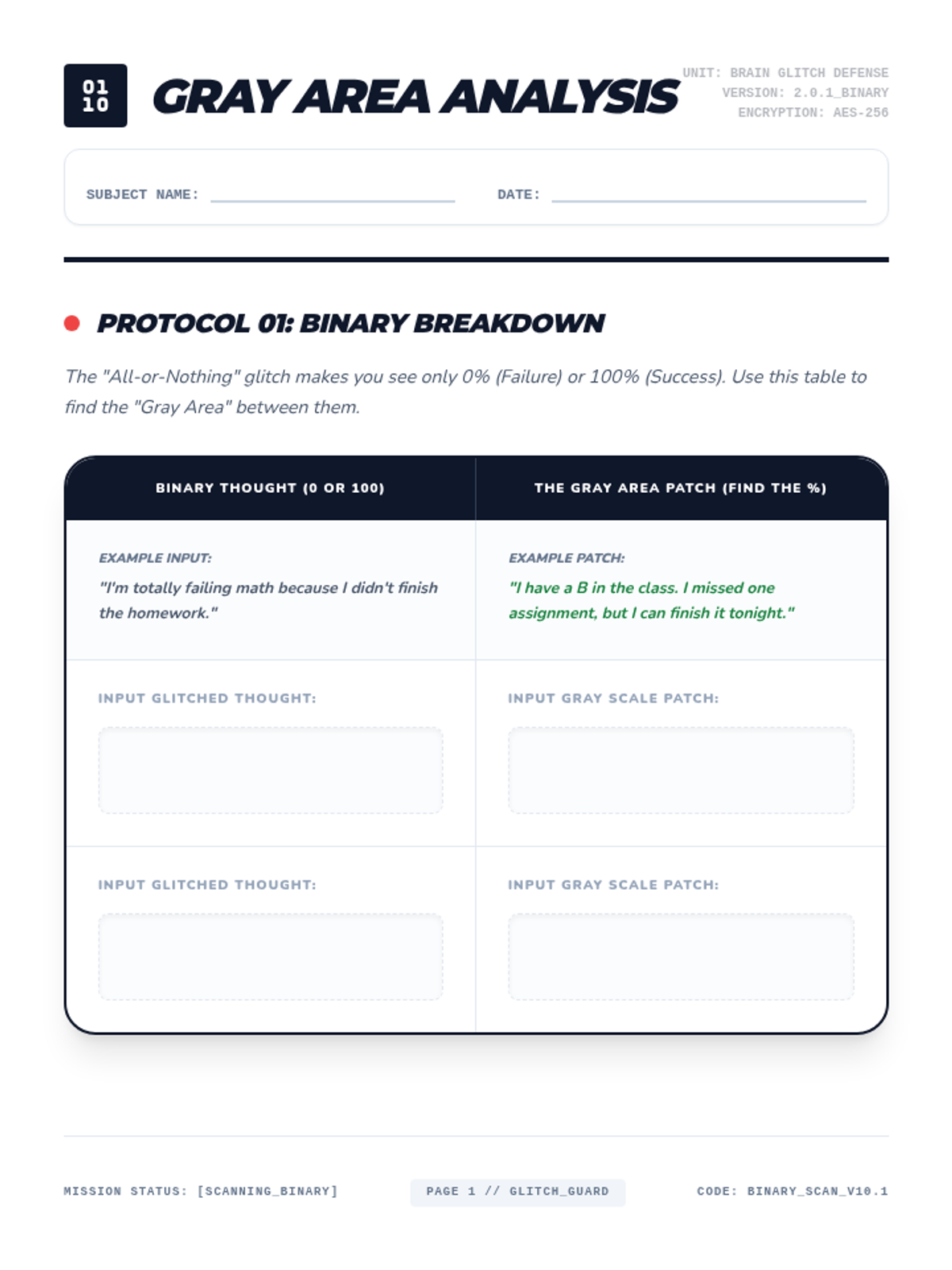 A student worksheet for identifying and challenging 'All-or-Nothing' thinking and 'Mental Filtering'. Features a visual 'Gray Scale' for plotting thought nuance and a table for practicing binary breakdowns. Updated with strictly standardized 8.5x11 page sections.