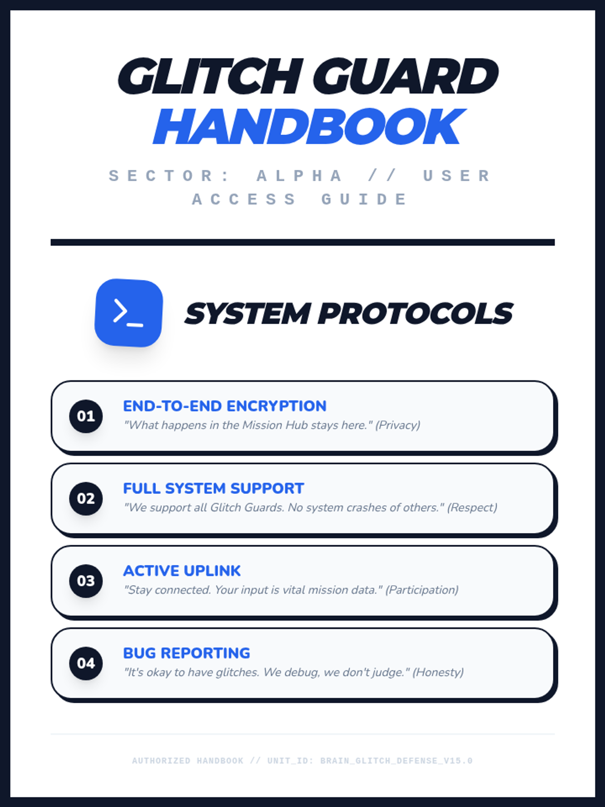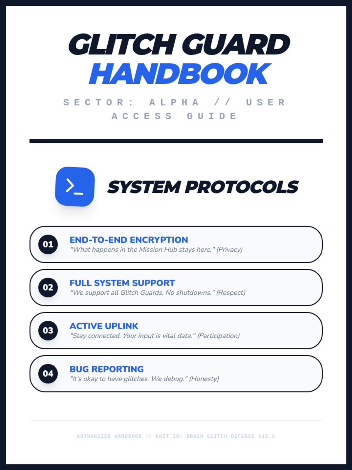 A complete student-facing booklet for the 6-week curriculum. Includes the 'System Protocols' (Norms) and individual 'Universal Mission Logs' for each session, providing a structured home for weekly login/logout rituals. Optimized for printing with clean 720x960 page sections and standard margins.
