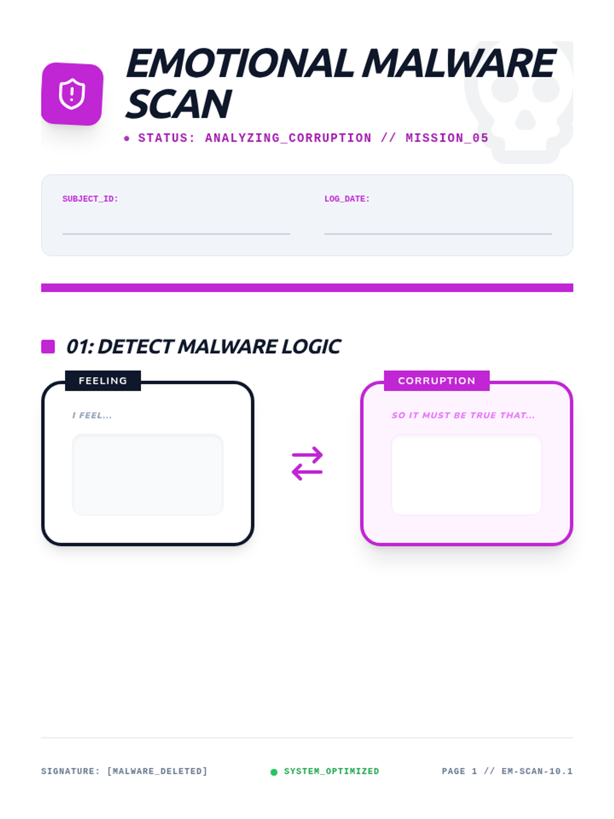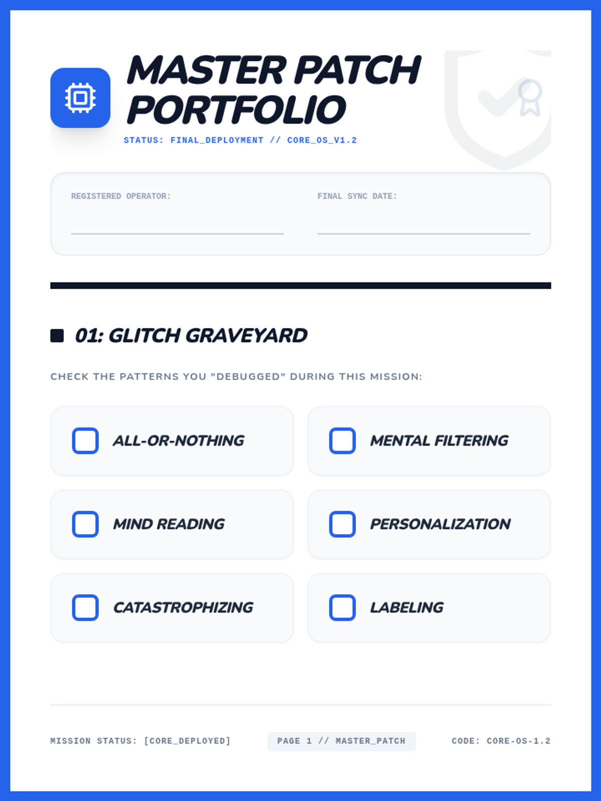 A final synthesis document for students to record their learning and define their 'New OS' (Core Beliefs). Features a 'Glitch Graveyard' and space for writing positive Core Beliefs. Updated with significantly increased writing space for student comfort.