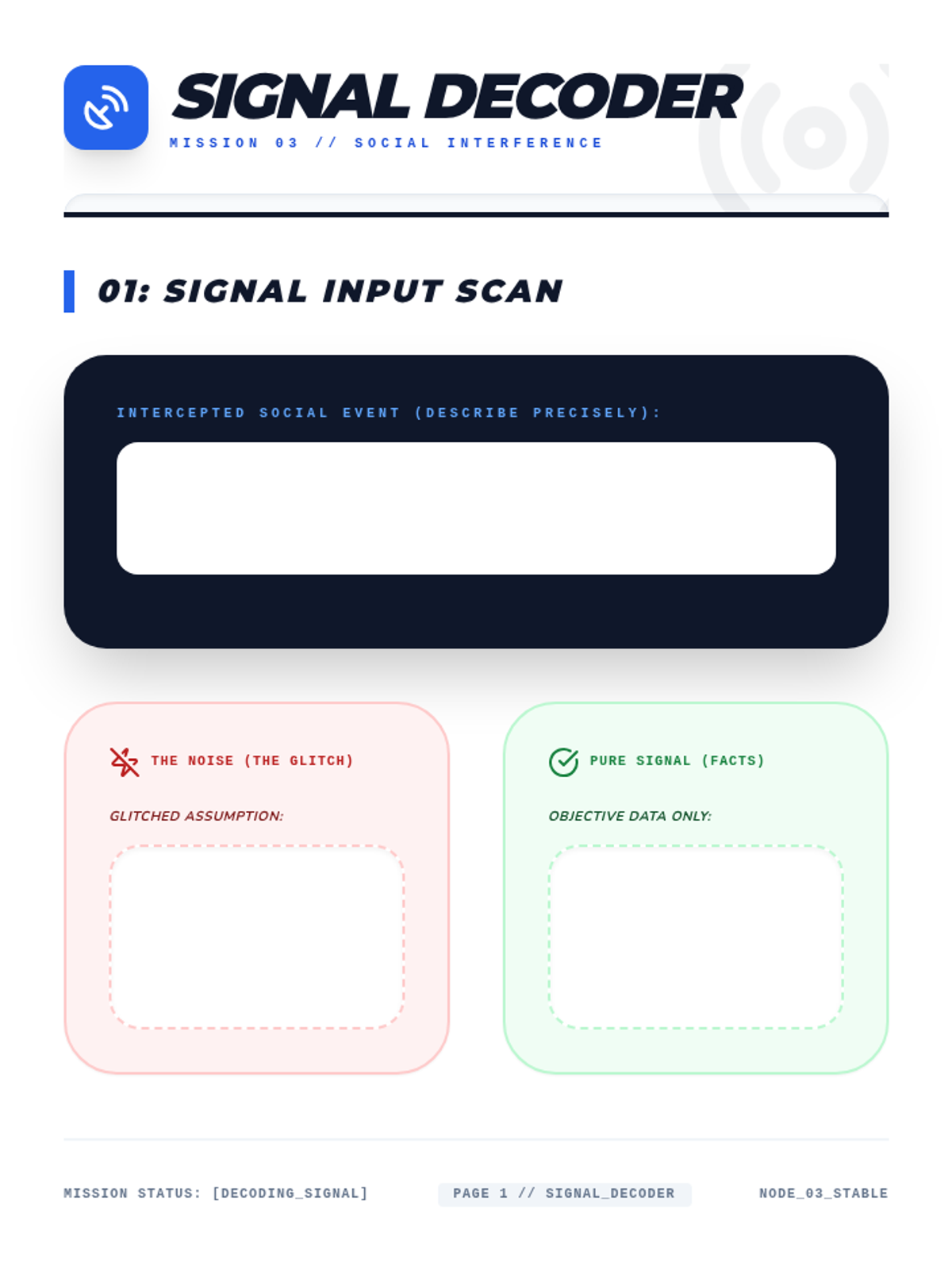 A student worksheet for decoding social 'signals'. Helps students differentiate between actual facts and 'glitch' thoughts related to Mind Reading and Personalization. Updated with increased writing space and standardized 8.5x11 page sections.