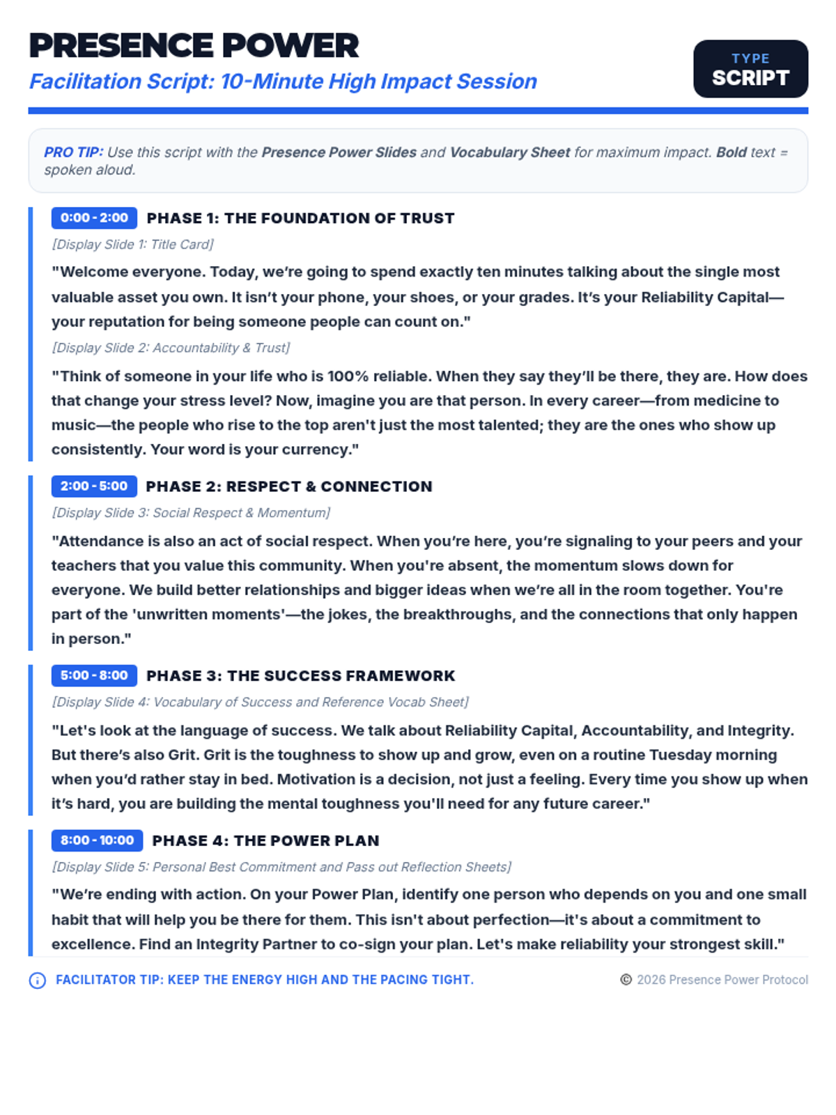 A high-impact, professional-themed teacher script for the 10-minute 'Presence Power' lesson. Updated with blue theme and vocabulary references.