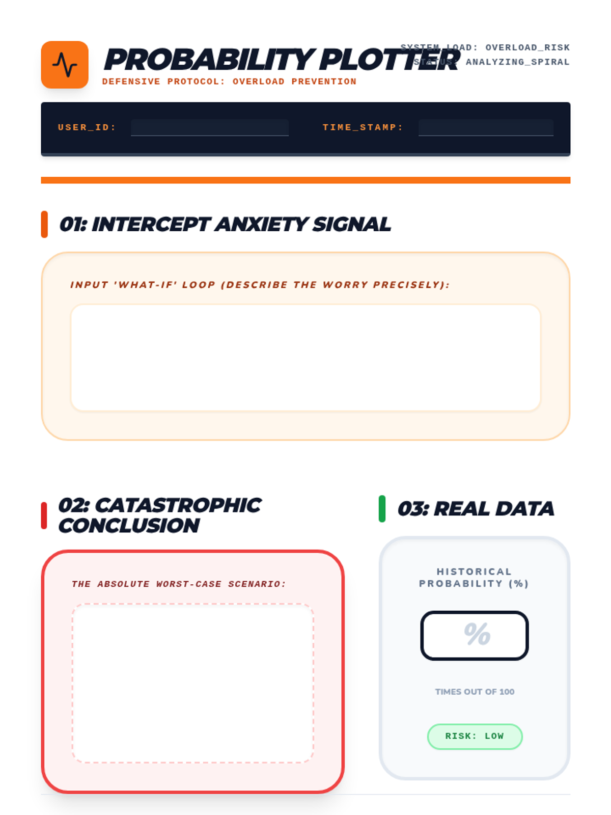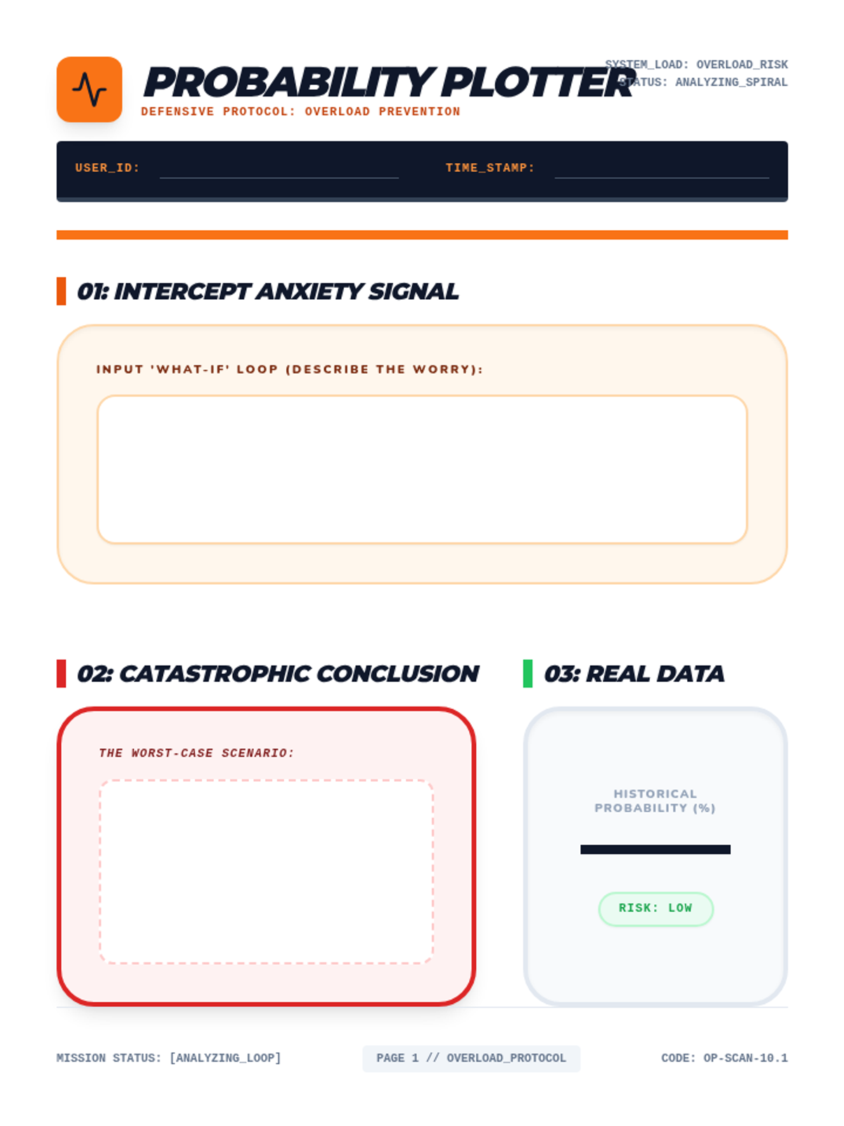 A student worksheet for analyzing 'What-If' spirals and catastrophizing. Features a probability calculation area and a contingency plan template (Best Case, Likely Case, Coping Code). Updated with strictly standardized 8.5x11 page sections and fixed handwriting areas.