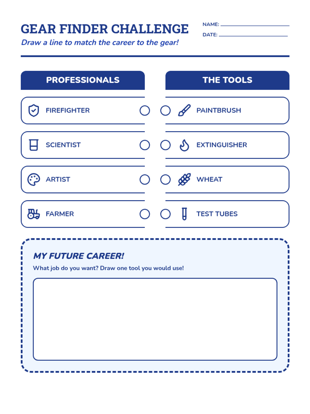 A reinforcement worksheet where students match professionals to their tools using lines and draw their own future career equipment in a creative space.