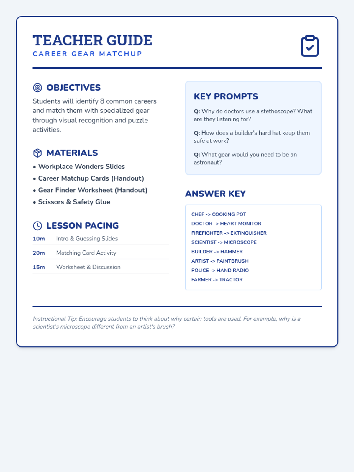 A teacher-facing guide providing lesson objectives, a pacing guide, discussion prompts, and an answer key for the Career Gear lesson materials.