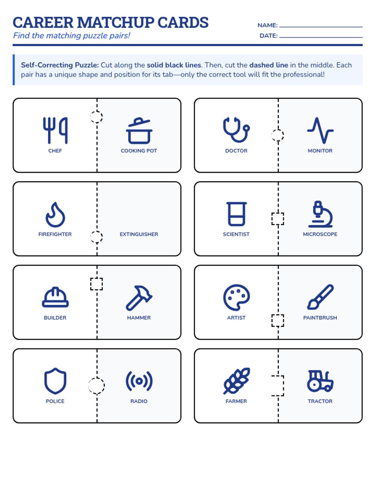 A set of 8 printable career-themed matching cards designed as interlocking puzzle pieces. Each pair connects a professional/career icon with its corresponding primary tool or equipment.