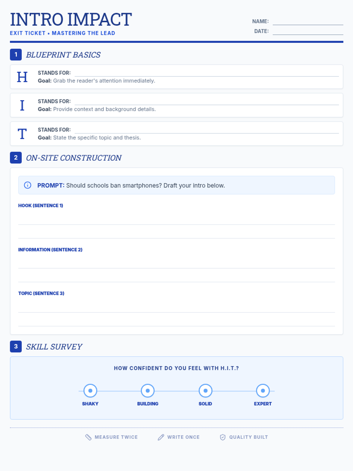 A formative assessment exit ticket for 7th-grade students to demonstrate their understanding of the H.I.T. (Hook, Information, Topic) strategy and practice writing a short introduction.