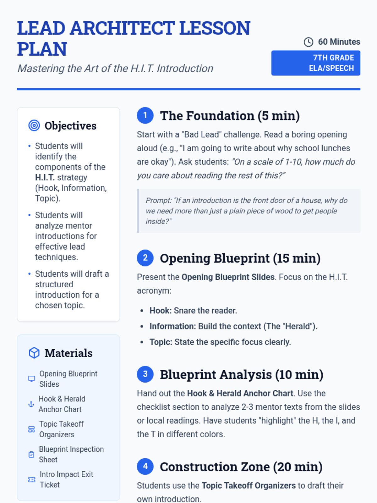 A detailed teacher-facing lesson plan for a 60-minute session on crafting effective introductions. It includes learning objectives, materials lists, a step-by-step procedural guide, and differentiation strategies.