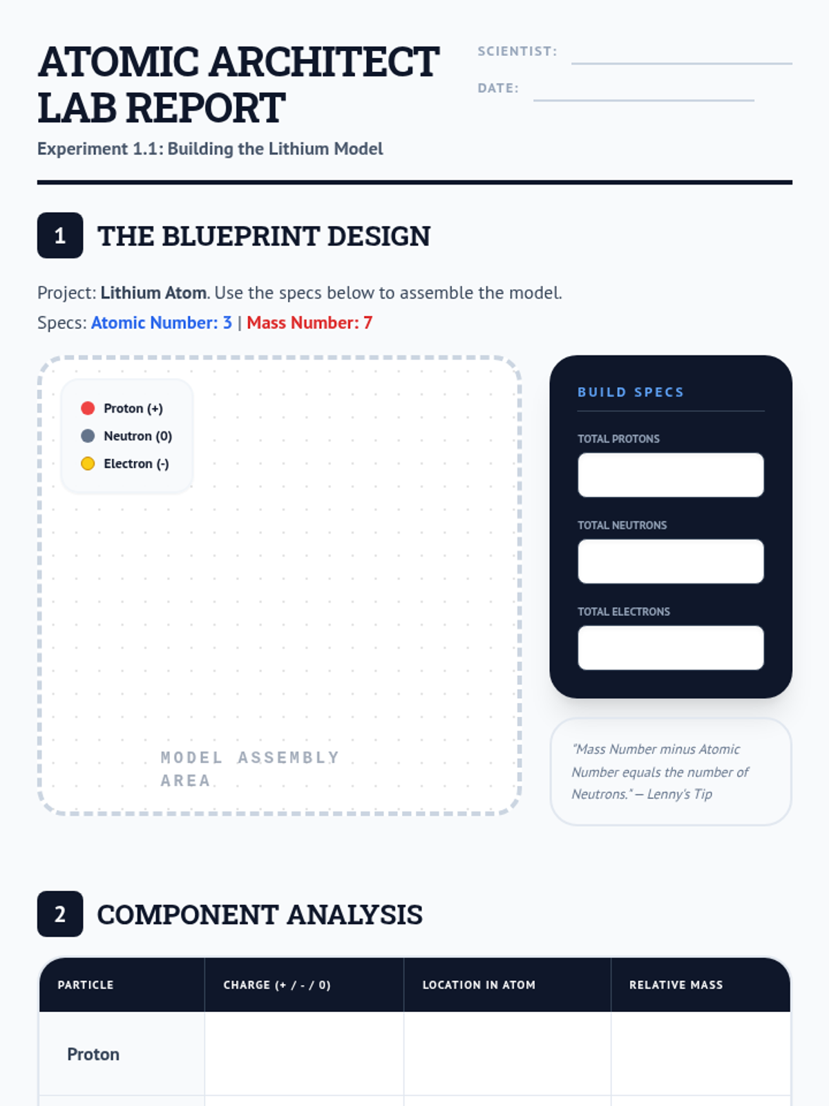 A student lab report worksheet for modeling atoms. Includes a drawing area for a Lithium atom, a subatomic properties table, and a conceptual challenge question.