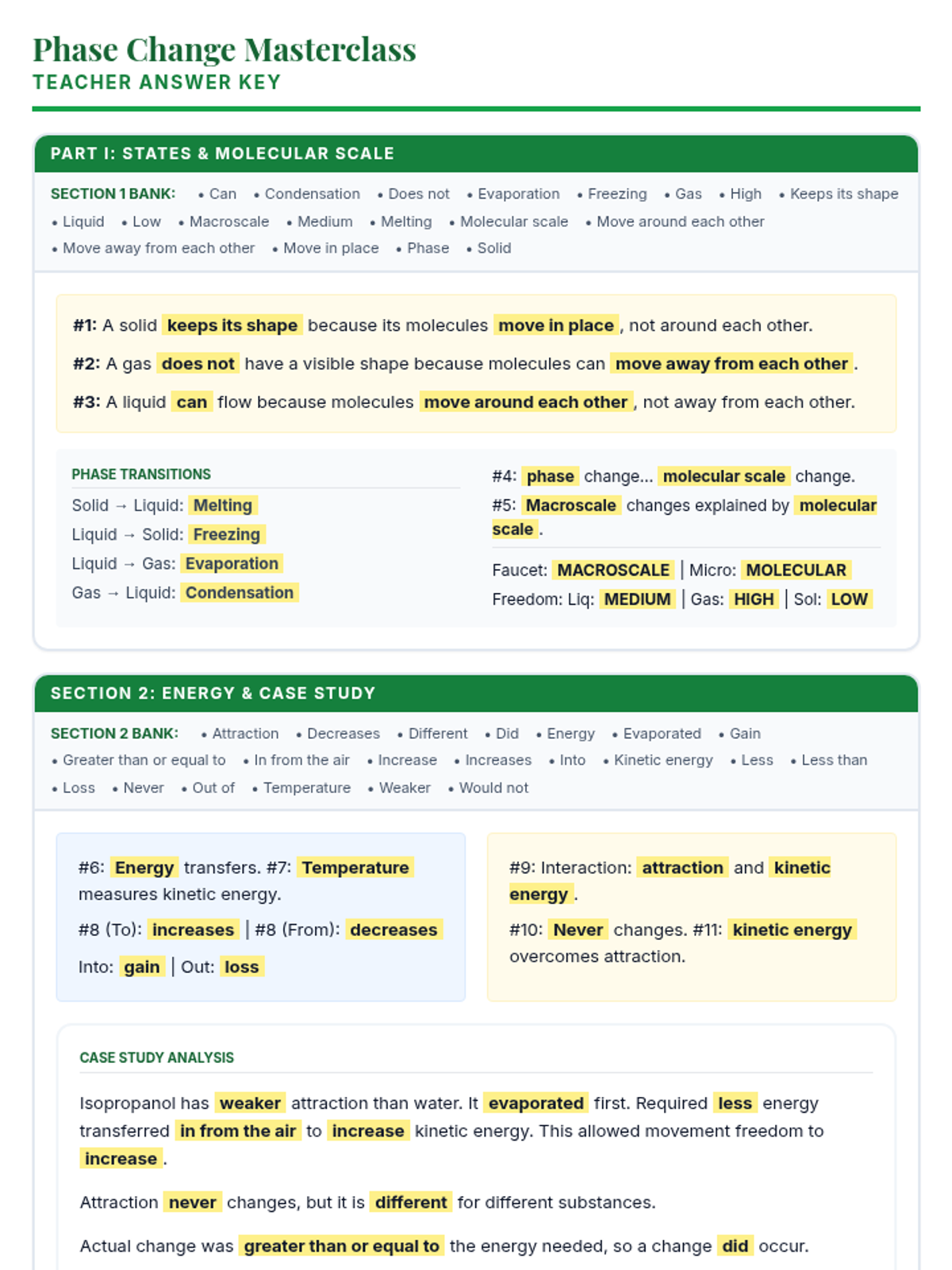 Optimized 1-page teacher answer key with section-specific word banks, consistent highlighting, and matched terminology for the student workbook.