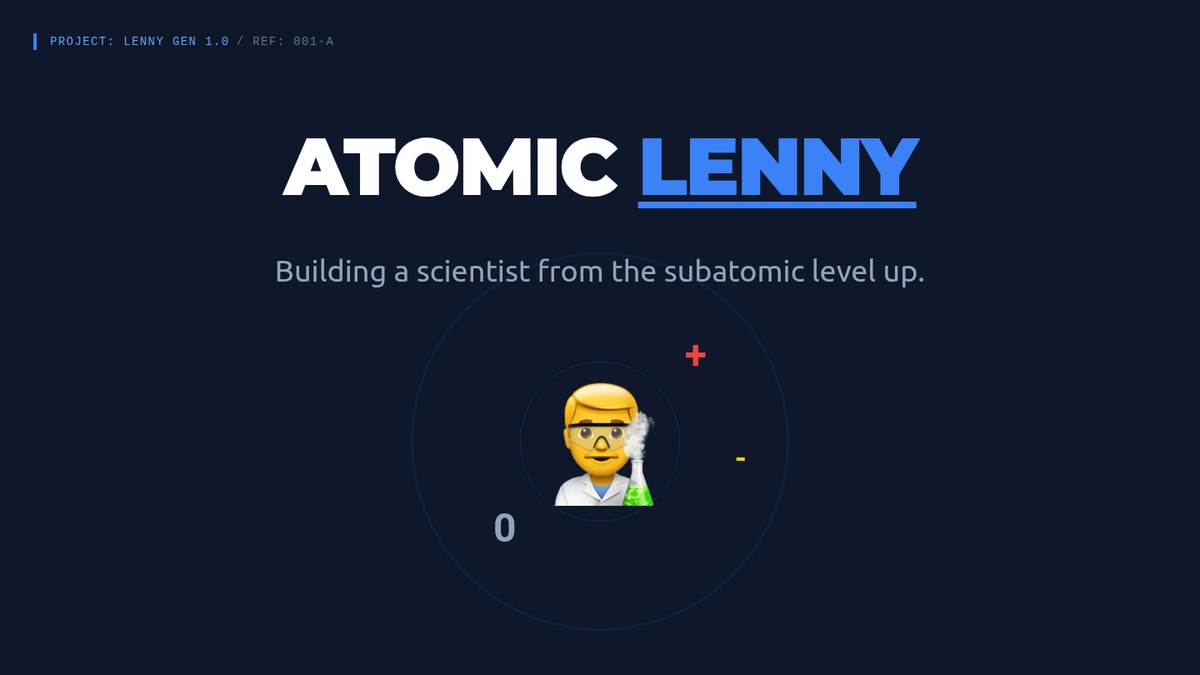 A 5-slide blueprint-themed presentation exploring atomic structure. Features animated subatomic particles and technical details about protons, neutrons, and electrons.