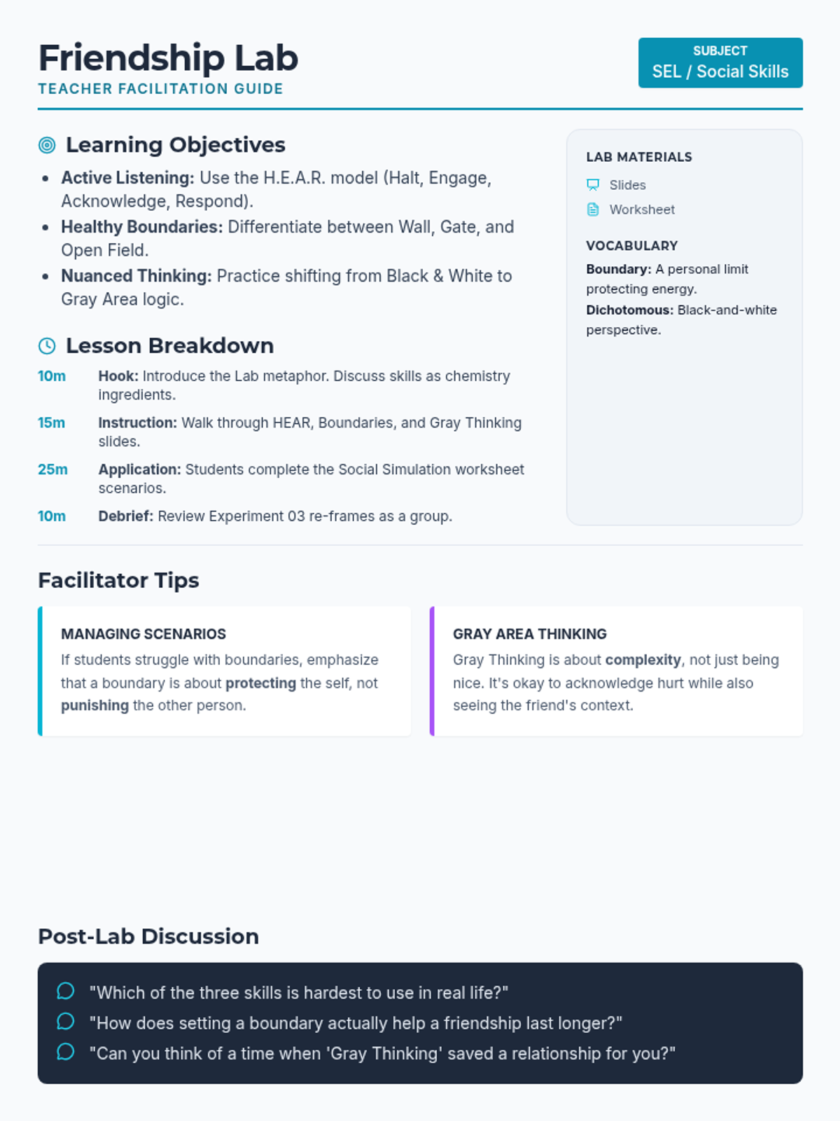 Updated teacher guide for the Friendship Lab lesson, revised to fit on a single page with improved text sizes and added discussion prompts for a better facilitator experience.
