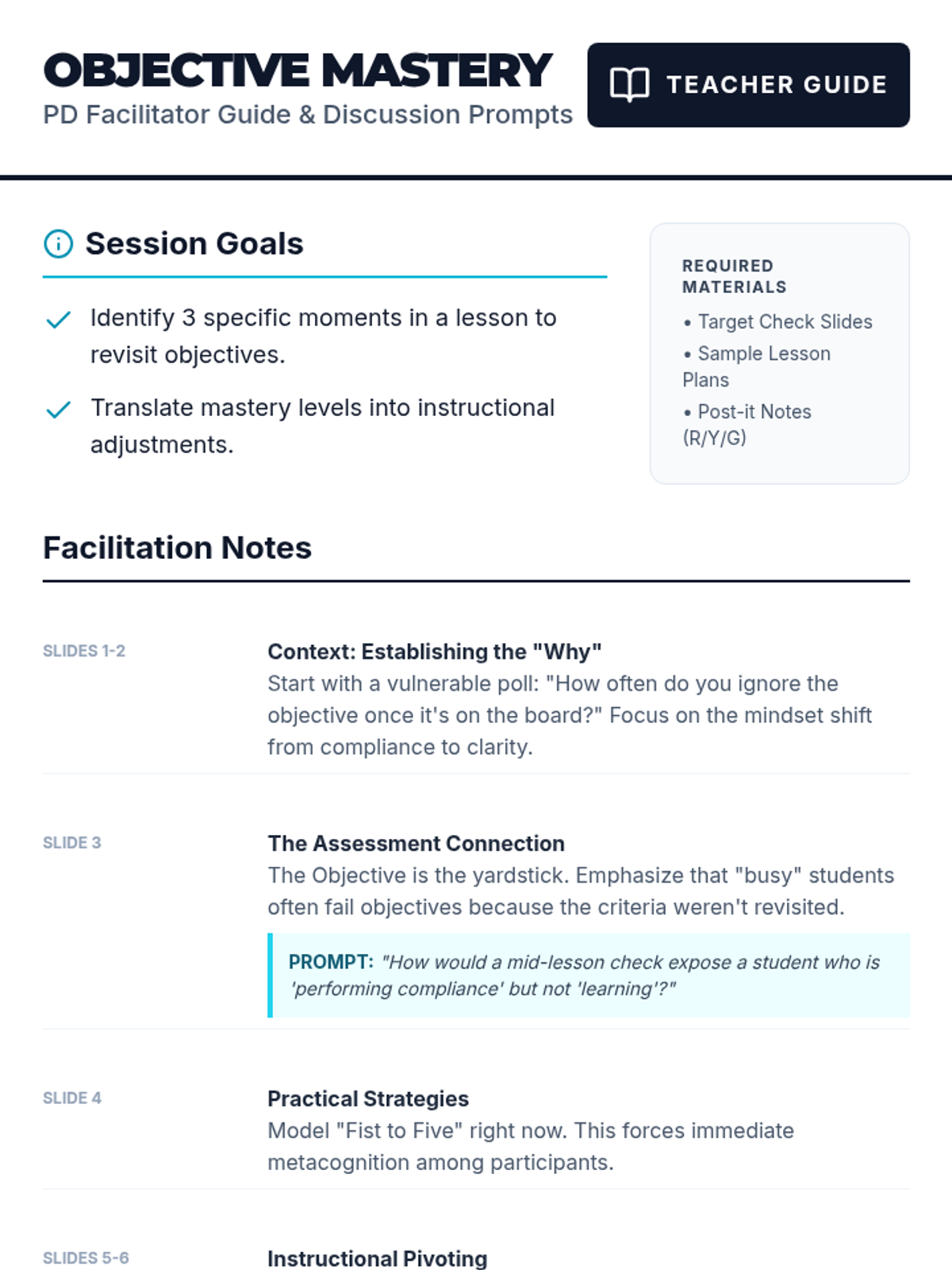 A facilitator guide for conducting a professional development workshop on revisiting lesson objectives, including talking points, discussion prompts, and an applied practice activity for teachers.