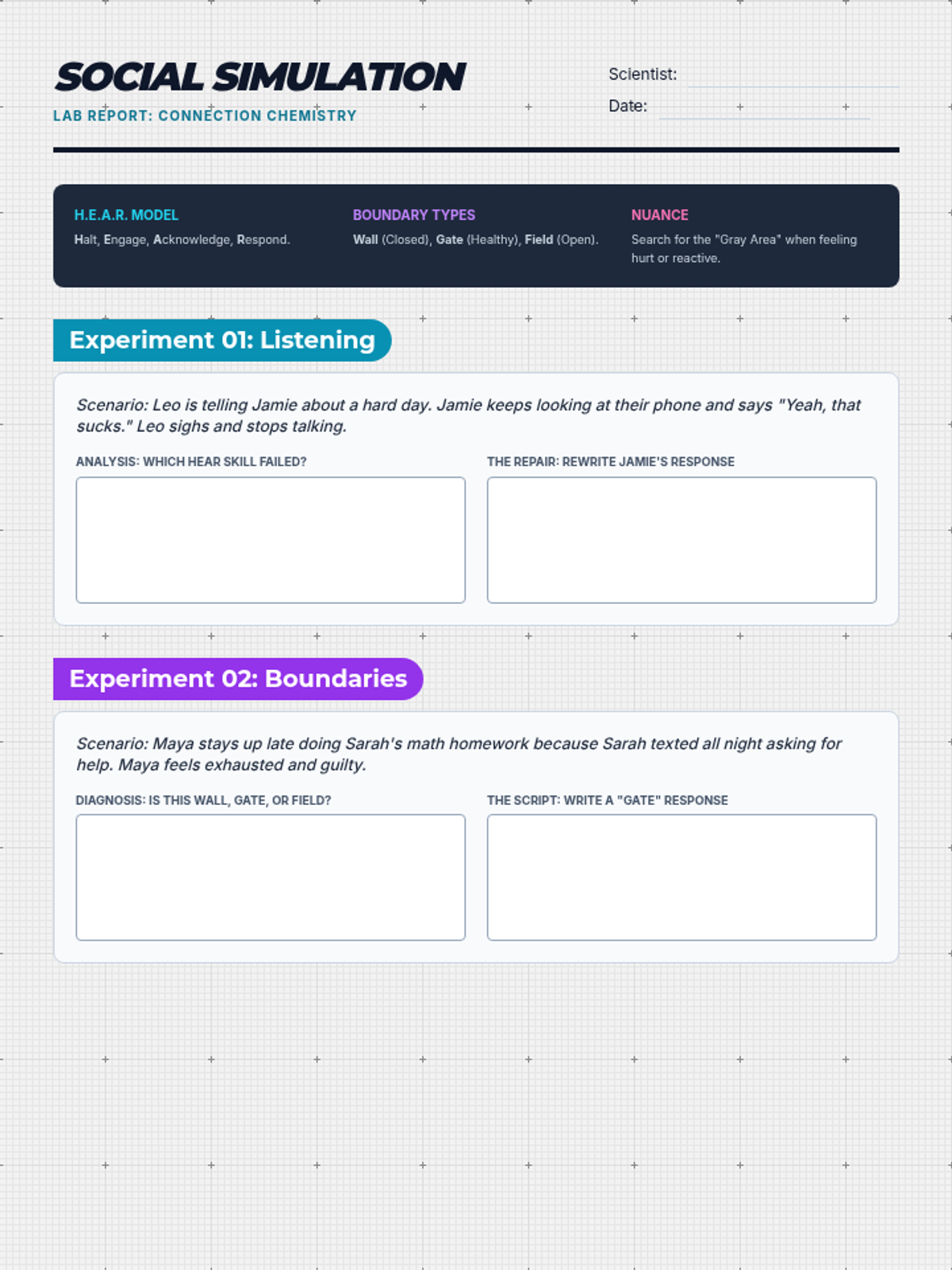A student-facing activity guide featuring small group missions focused on active listening and empathy, including a 'Social Detective' reflection worksheet.