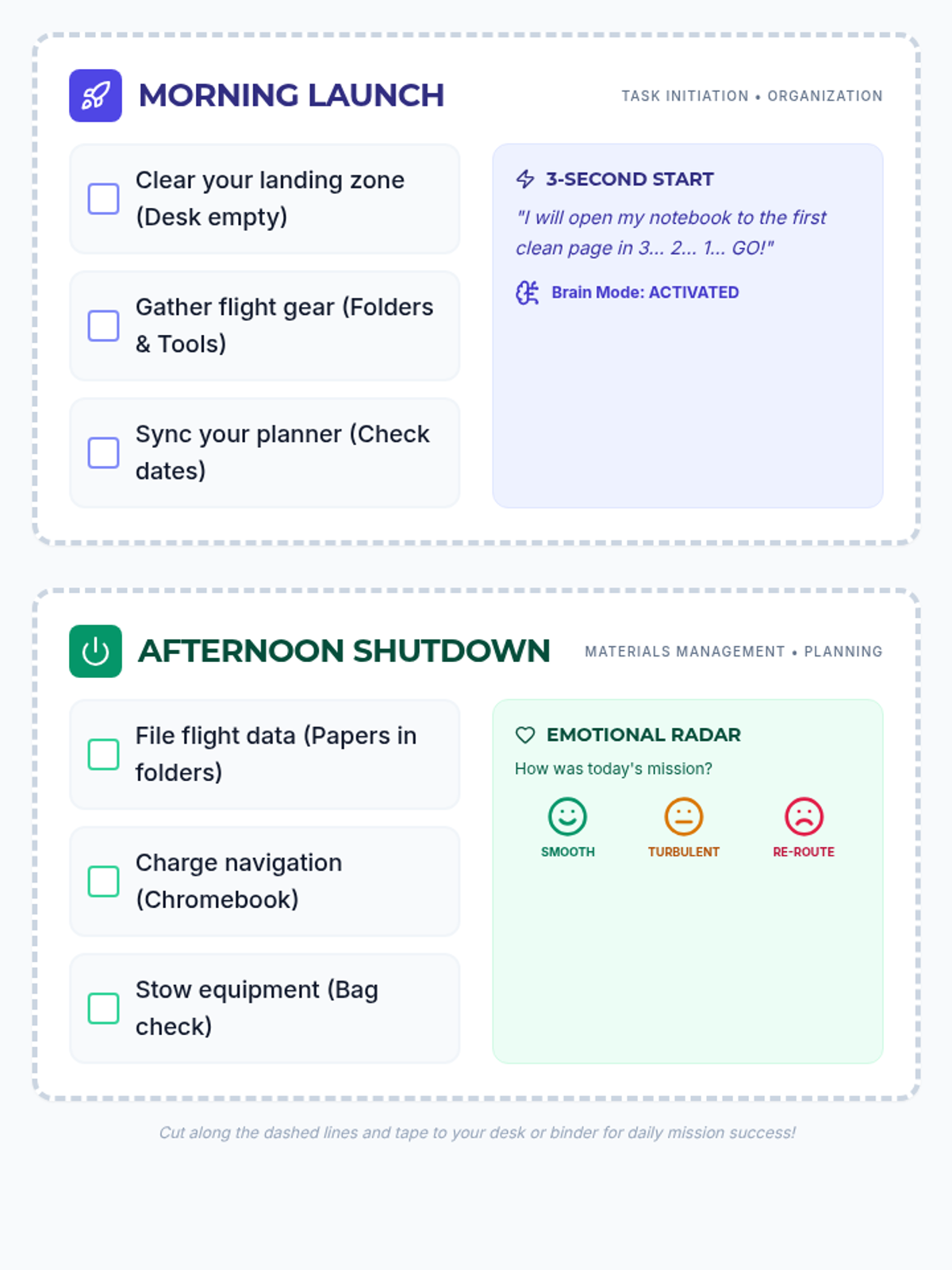 A set of printable desk strips designed for middle schoolers to manage morning arrivals and afternoon departures. Features visual checklists for organization, task initiation prompts, and an emotional regulation check-in.