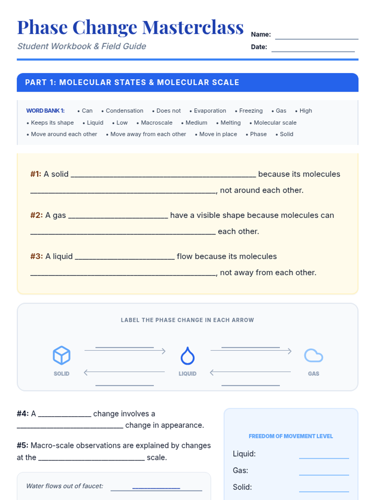 Polished 2-page student workbook with section-specific word banks, consistent handwriting spaces (up to 2.1 leading), and high-contrast instructional diagrams. Ensures all content fits on two sheets.