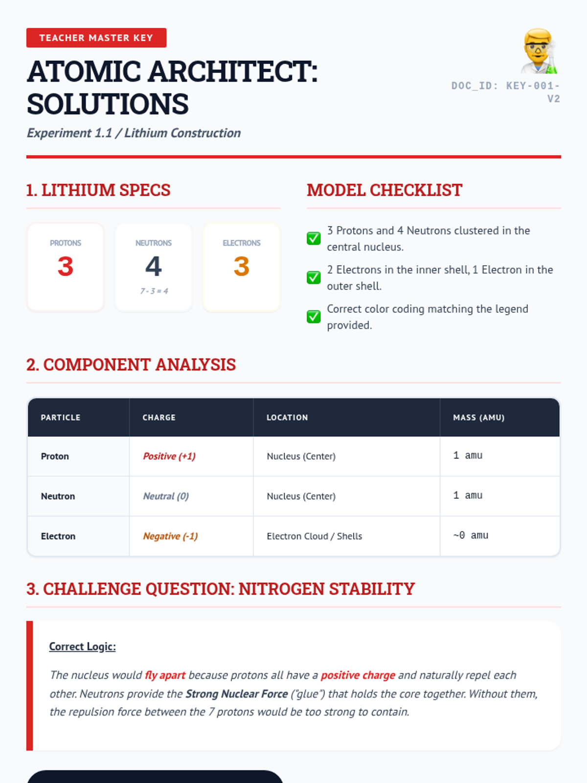 The answer key for the Atomic Architect worksheet, providing solutions for the Lithium atom model, the subatomic particle table, and the stability concept question.