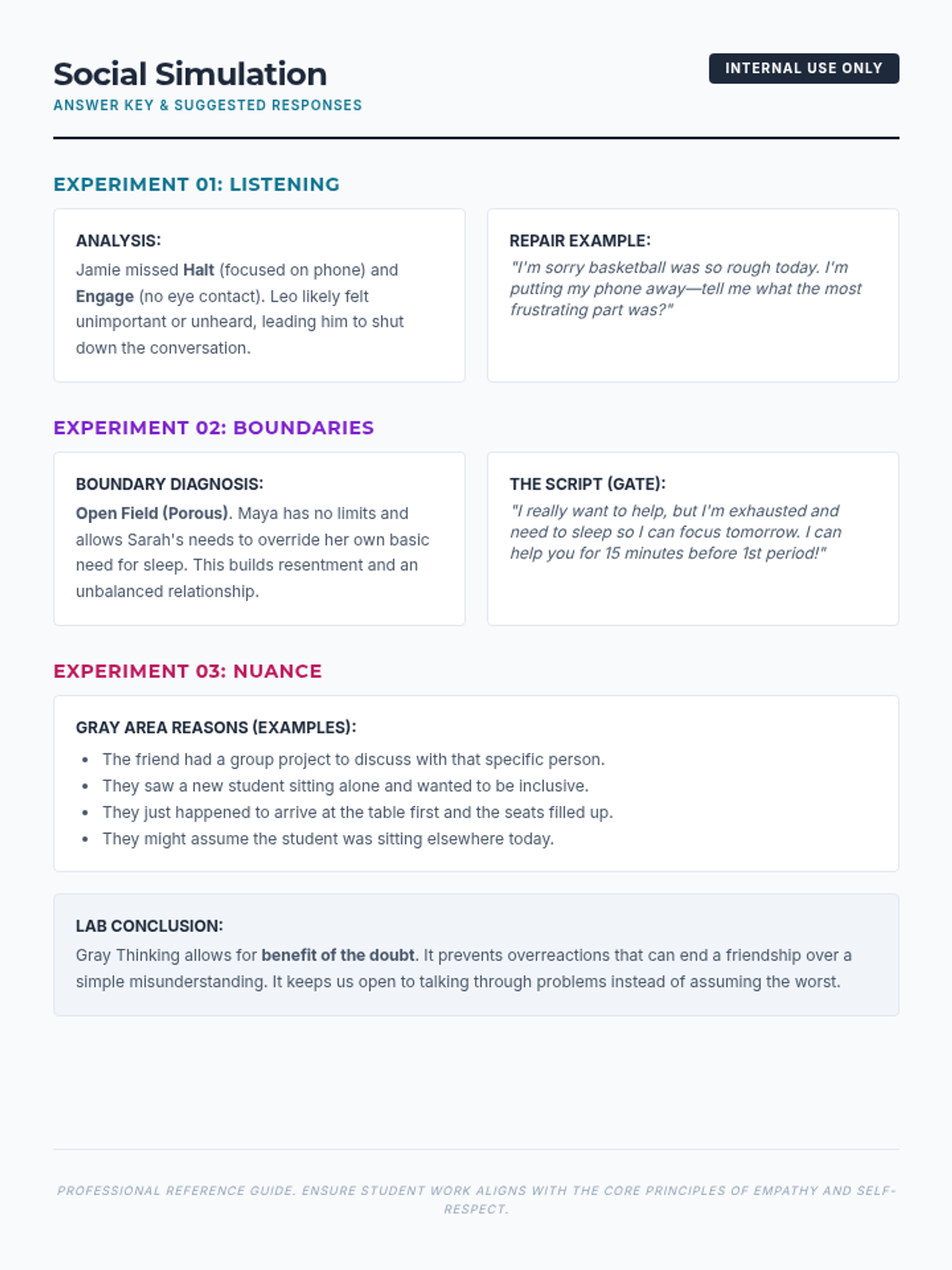 Updated answer key for the Social Simulation worksheet, condensed into a single page with improved layout and clear suggested responses for all experiments.