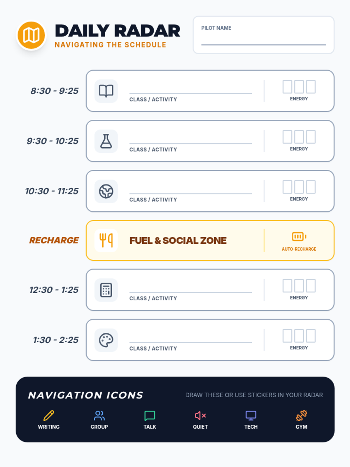 A visual daily schedule template for middle schoolers. Features time slots with icons for various subjects and activities, plus an "Energy Level" battery to help students predict and manage their cognitive load throughout the day.