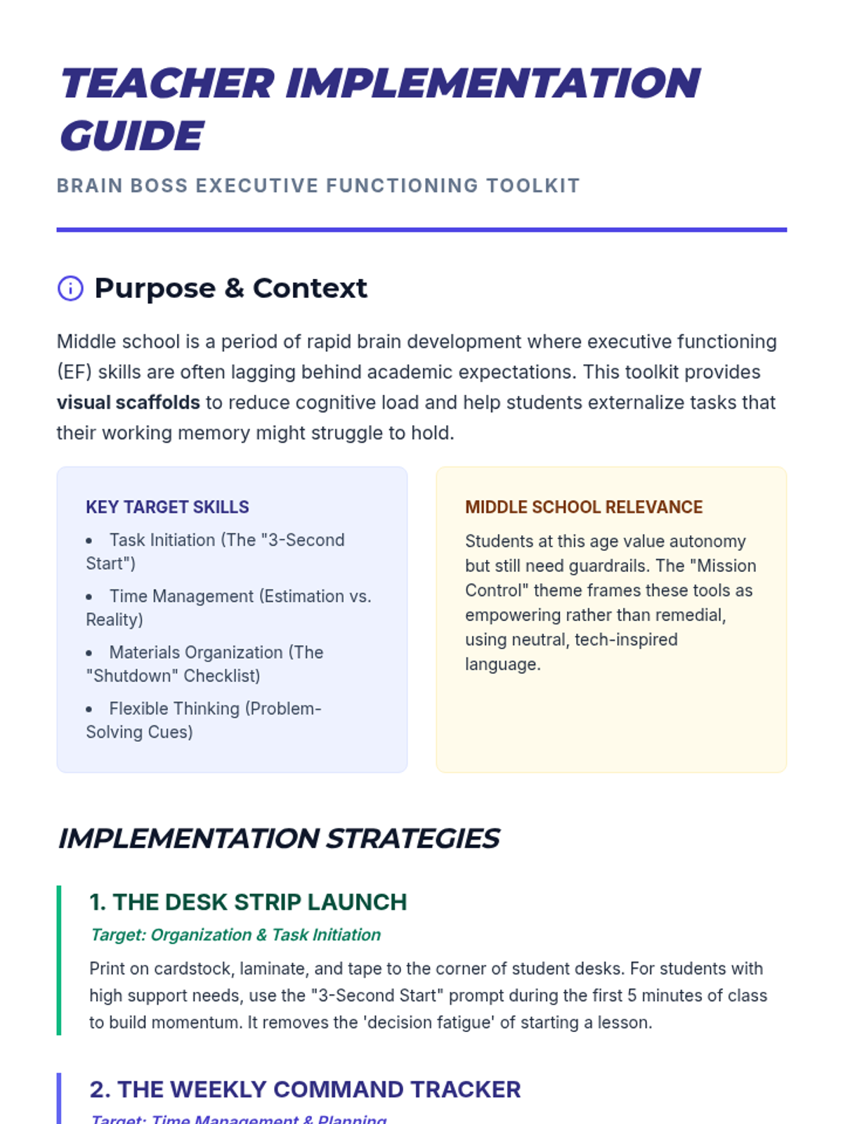 A facilitation guide for teachers on how to effectively use the Brain Boss executive functioning tools. Includes implementation strategies for task initiation, time management, and scaffolding techniques for middle schoolers.